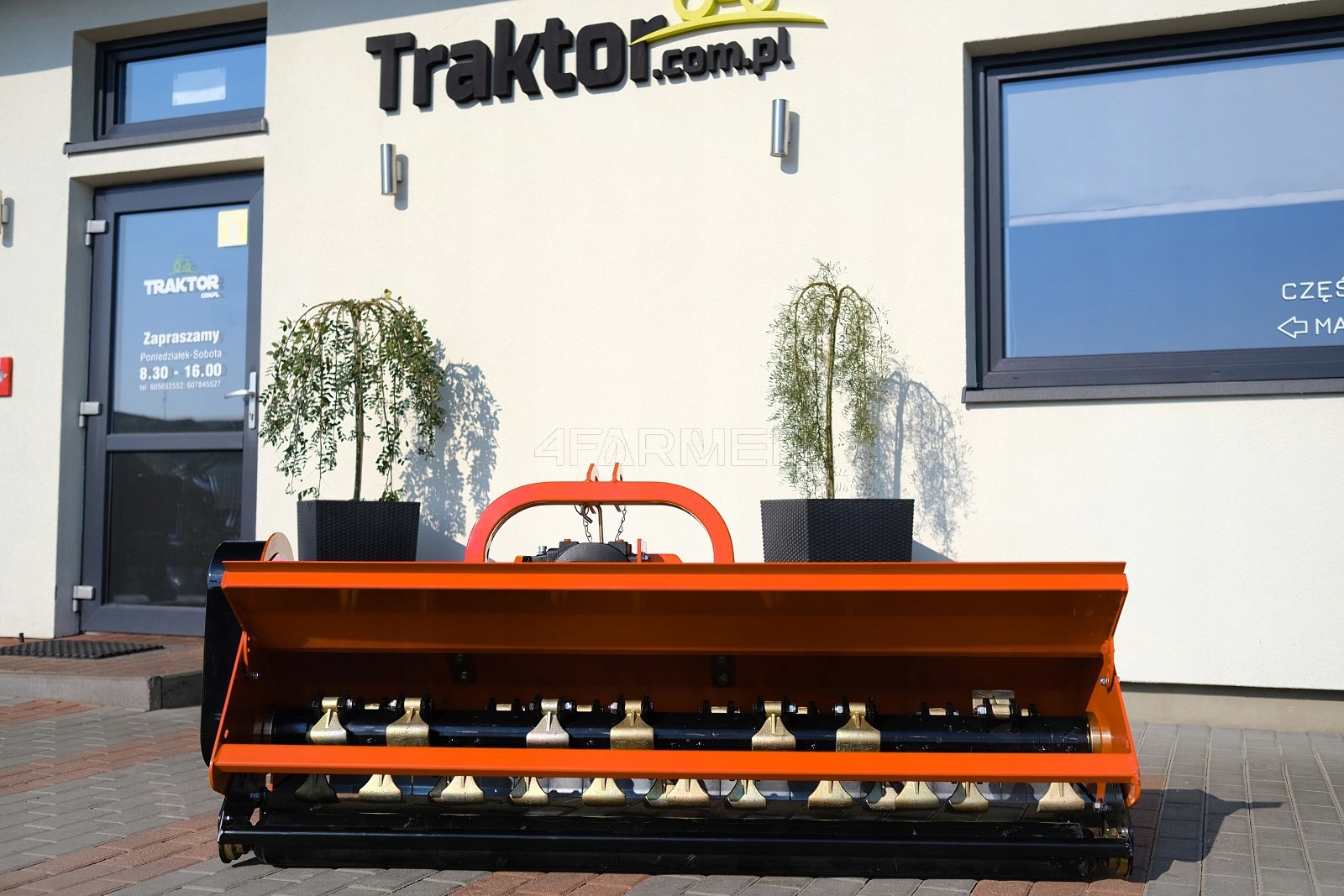 цеповая косилка (мульчер) EFGC-K 165 4FARMER имеет ширину скашивания 165 см, это одна из самых больших из восьми доступных ширин. Помимо цельного рабочего вала, оснащенного горизонтально расположенными измельчающими битами, косилка имеет еще задний (ведомый) вал. Он позволяет регулировать высоту среза и удерживать косилку на выбранной высоте. Привод от ВОМ трактора — 540 об/мин.