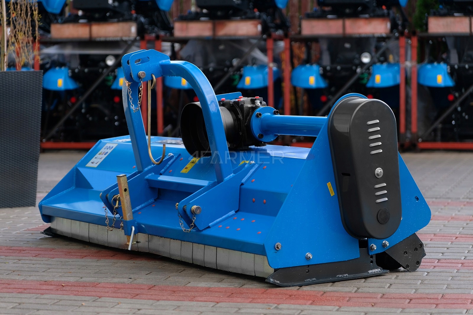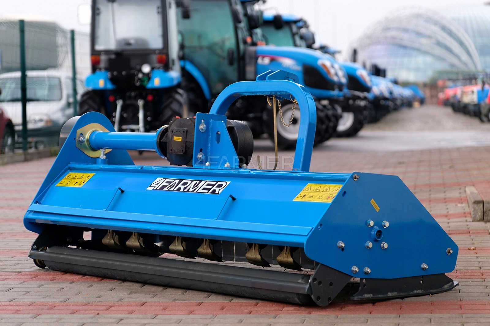цеповая косилка (мульчер) EFGC-K 165 4FARMER имеет ширину скашивания 165 см, это одна из самых больших из восьми доступных ширин. Помимо цельного рабочего вала, оснащенного горизонтально расположенными измельчающими битами, косилка имеет еще задний (ведомый) вал. Он позволяет регулировать высоту среза и удерживать косилку на выбранной высоте. Привод от ВОМ трактора — 540 об/мин.
