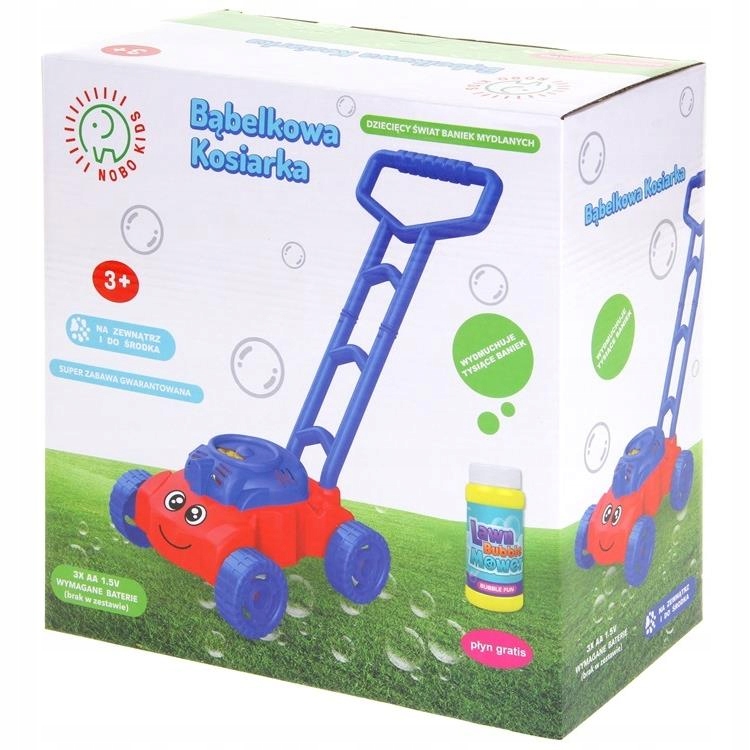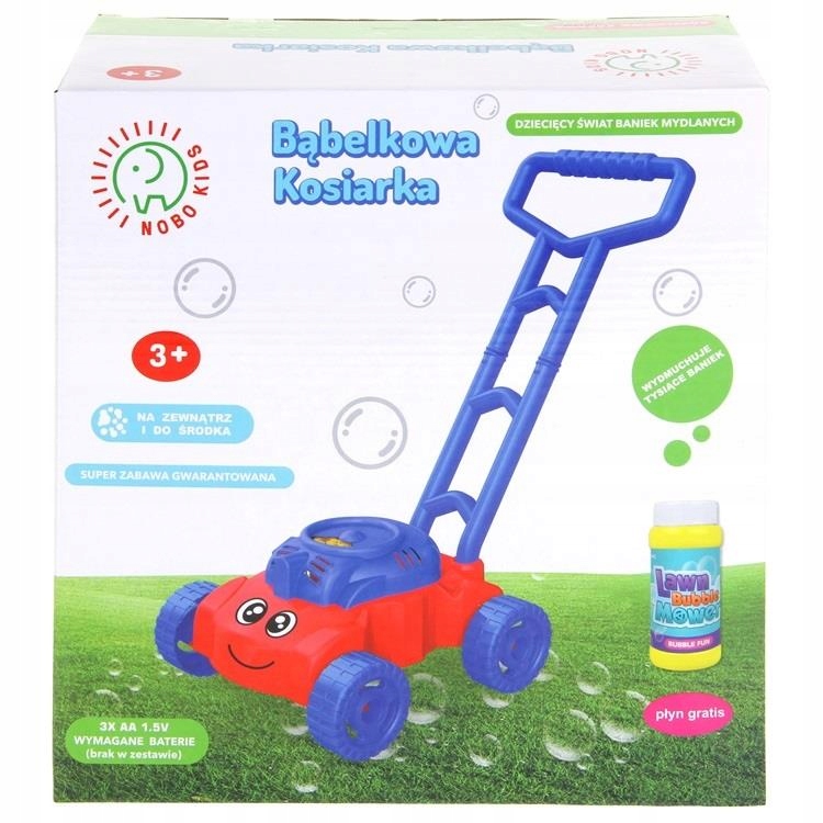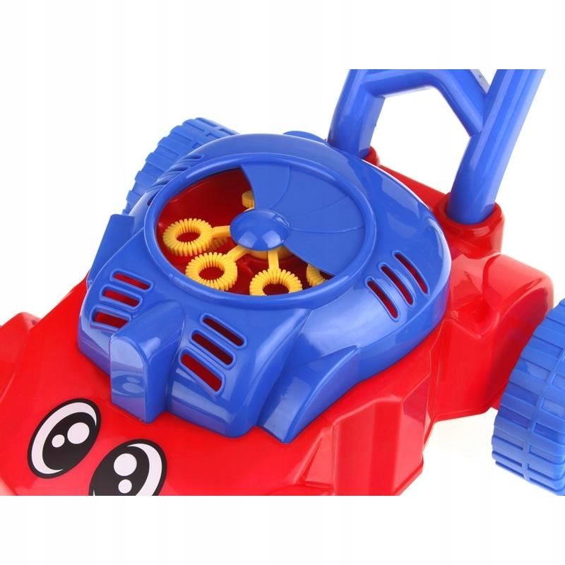 Чтобы насладиться видом сверкающих пузырей, просто налейте в газонокосилку прилагаемую жидкость и нажмите кнопку. Газонокосилка начнет выдувать множество пузырей. Колеса издают странный шум при толкании газонокосилки.