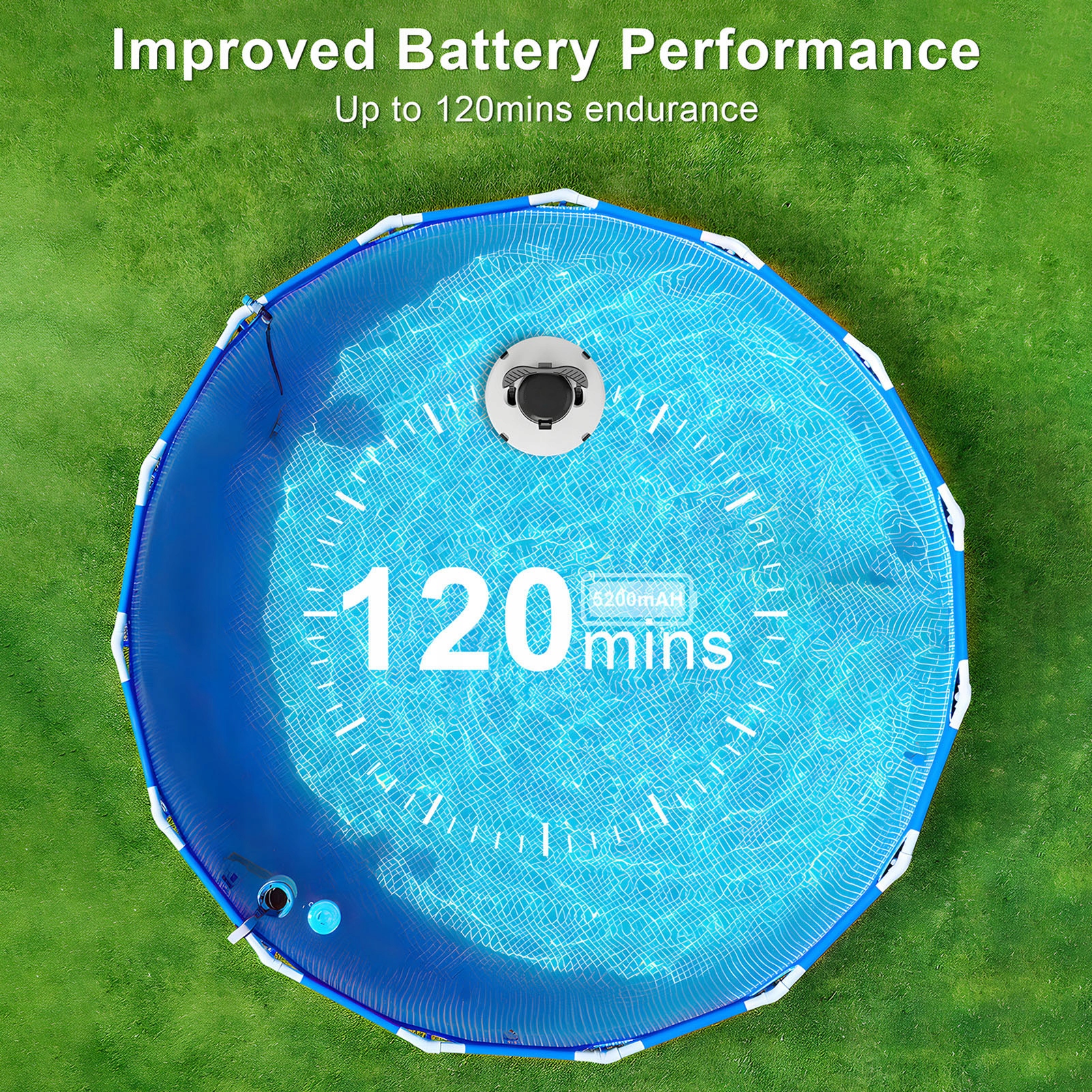 2. Большая емкость аккумулятора: Благодаря аккумулятору большой емкости 11,5 В, 5200 мАч этот пылесос для бассейна может работать до 120 минут без подзарядки, гарантируя, что он может очищать даже самые большие бассейны и обеспечивает оптимальный очищающий эффект в радиусе 80 квадратных метров.