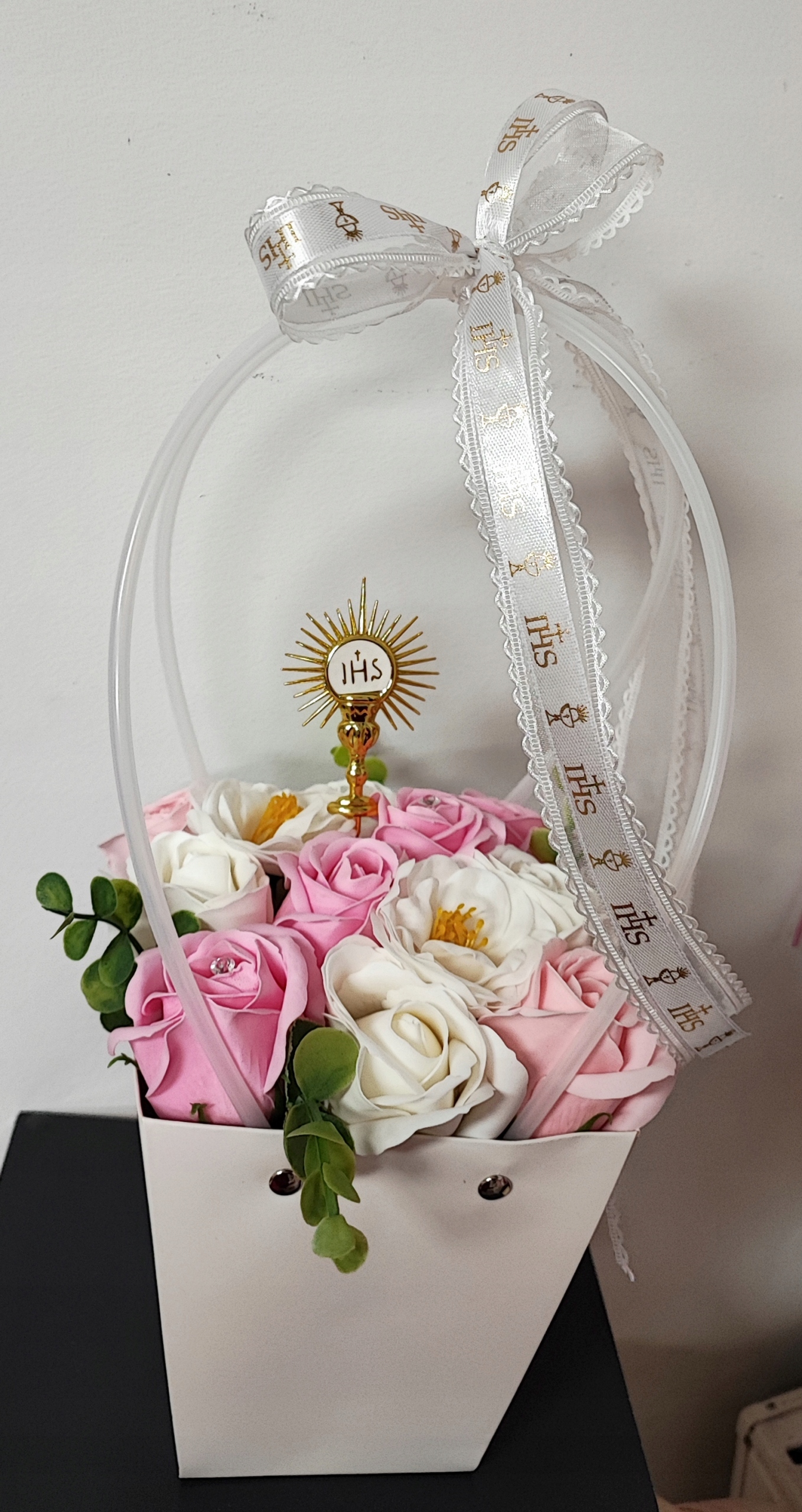 Декоративная коробка в форме белой корзины, наполненной розами, является отличным даром для молодых людей, столь же возвышенного, как первое святое причастие. ... что сделает получателя большим количеством ароматной радости ...