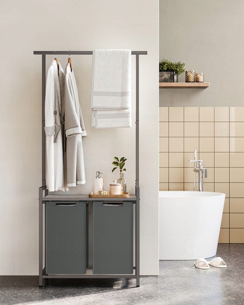 - [твердое и стабильное], изготовленное из стальных труб с диаметром 20 мм и сопотовой щедрости толщиной 20 мм, корзина для белья твердое и с нагрузкой до 90 кг. Регулируемые ноги обеспечивают баланс. Дополнительная защита наконечника обеспечивает дополнительную стабильность