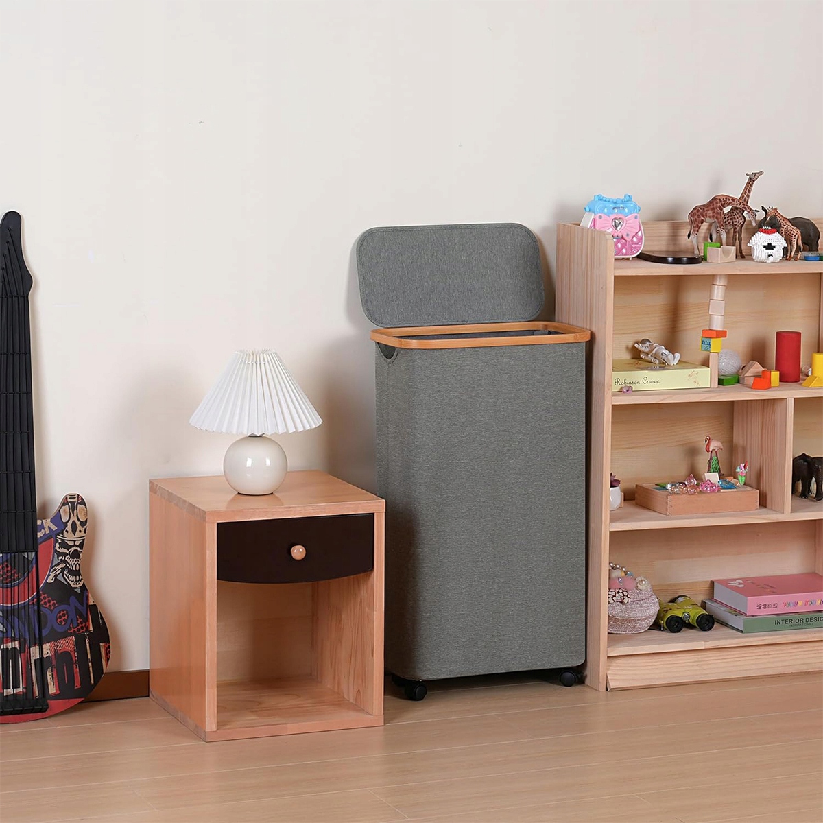 Корзина для белья имеет бамбуковую раму, которая сверху служит ручкой, поэтому ее можно легко поднять. Корзина для белья с крышкой предотвращает попадание пыли и нейтрализует запахи. Серая ткань Оксфорд 600D делает ее прочной и долговечной даже при длительном использовании.