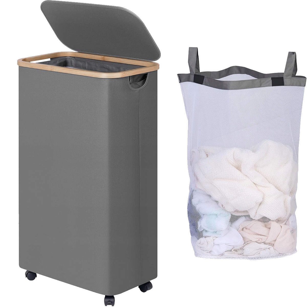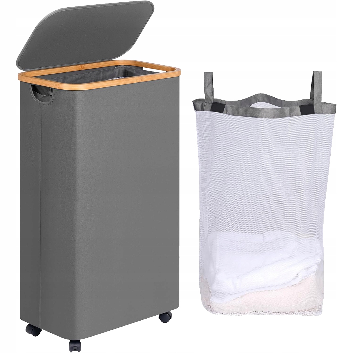Корзина для белья YOUKUKE на колесиках 75 л (43,5*25*75 см), тонкая корзина для белья с крышкой, серая складная корзина для белья с бамбуковыми ручками и съемной сумкой для спальни, ванной комнаты, белья