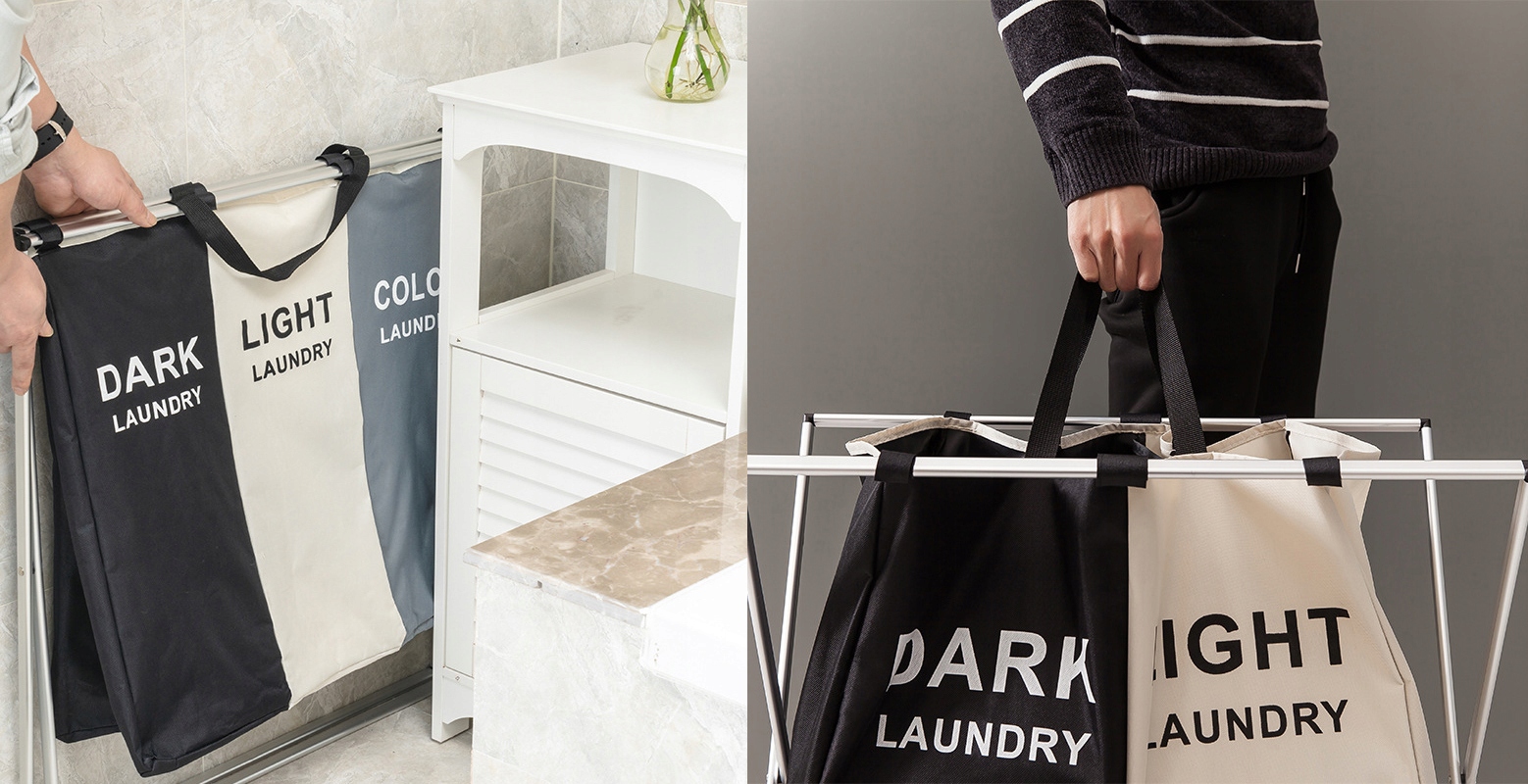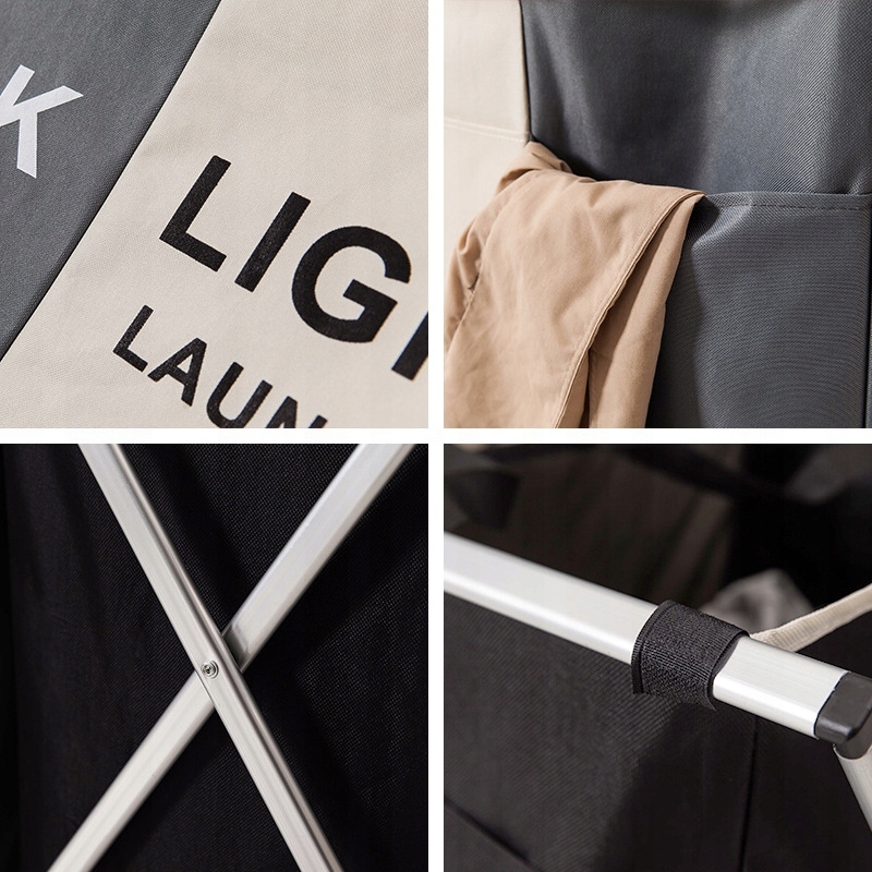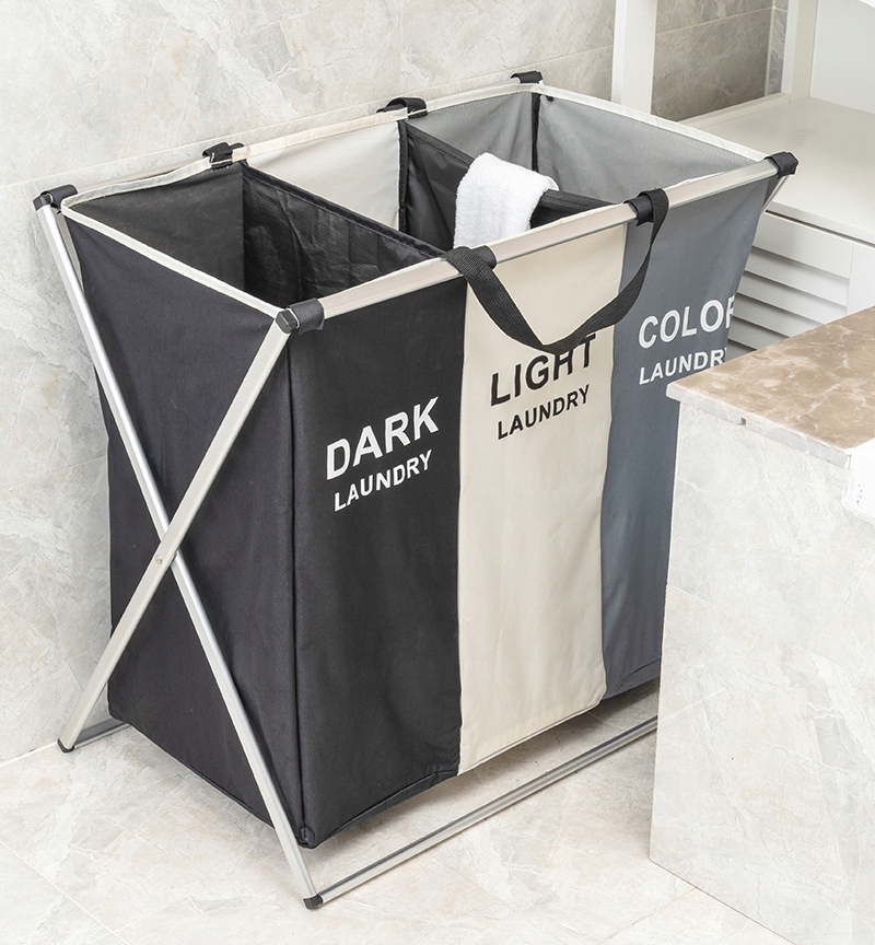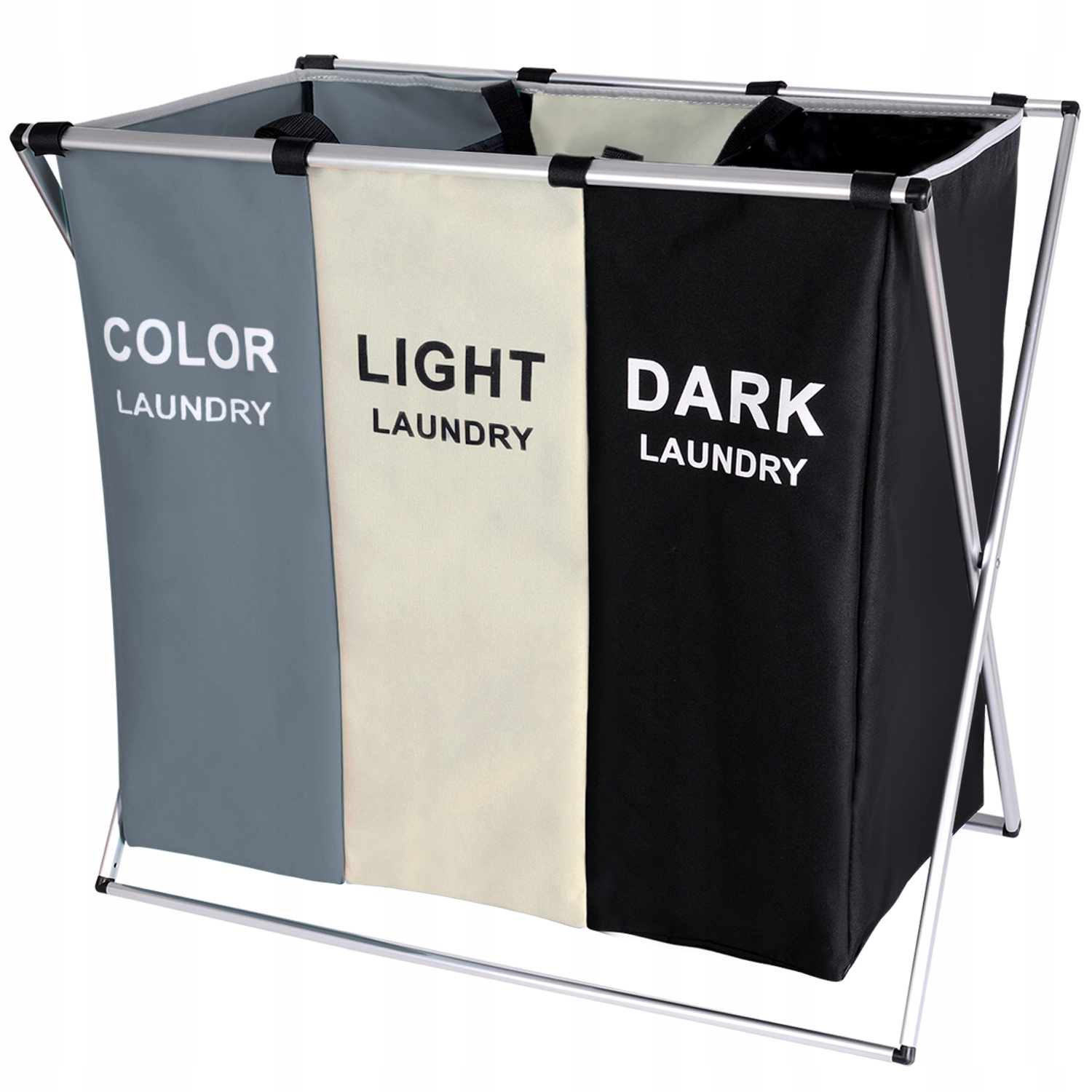 Корзина для белья с 3 отделениями, изготовлена из прочного материала на алюминиевой раме. Облегчит быструю сортировку белья с учетом его цвета.