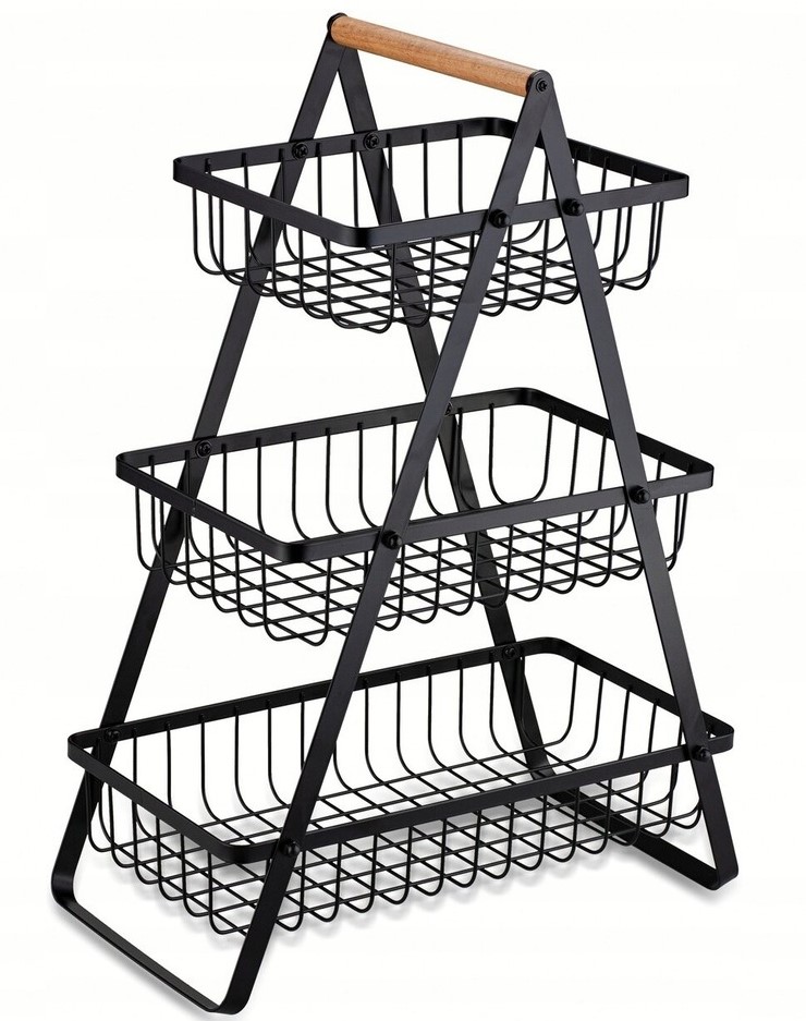 Корзина для фруктов с деревянной ручкой 35 х 18 х 46 см - черного цвета, трехуровневая универсальная корзина и удобный органайзер.