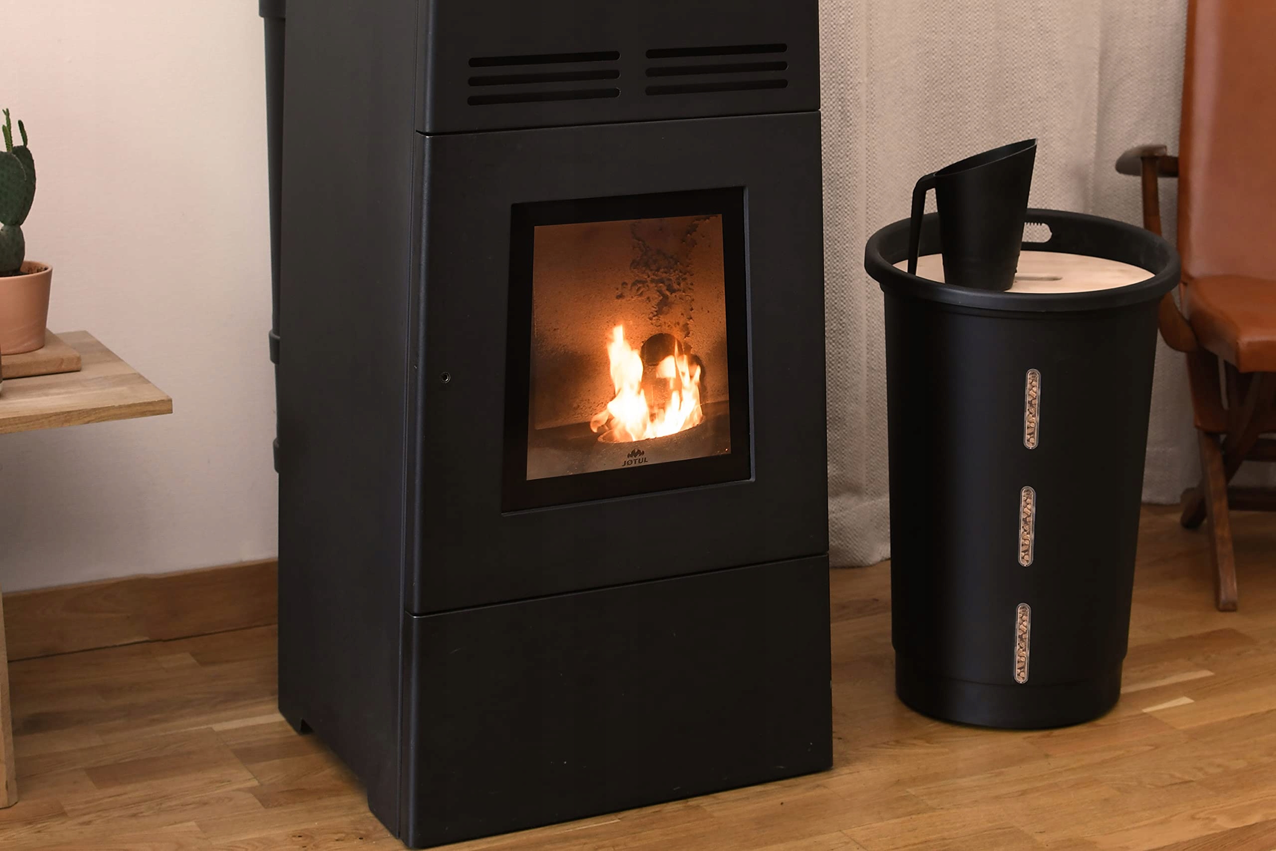 ДИЗАЙН: контейнер для пеллет Jura Montania объемом 38 л с мягкими изгибами, вмещающий до 25 кг пеллет, идеально подходит для хранения древесных пеллет рядом с плитой.