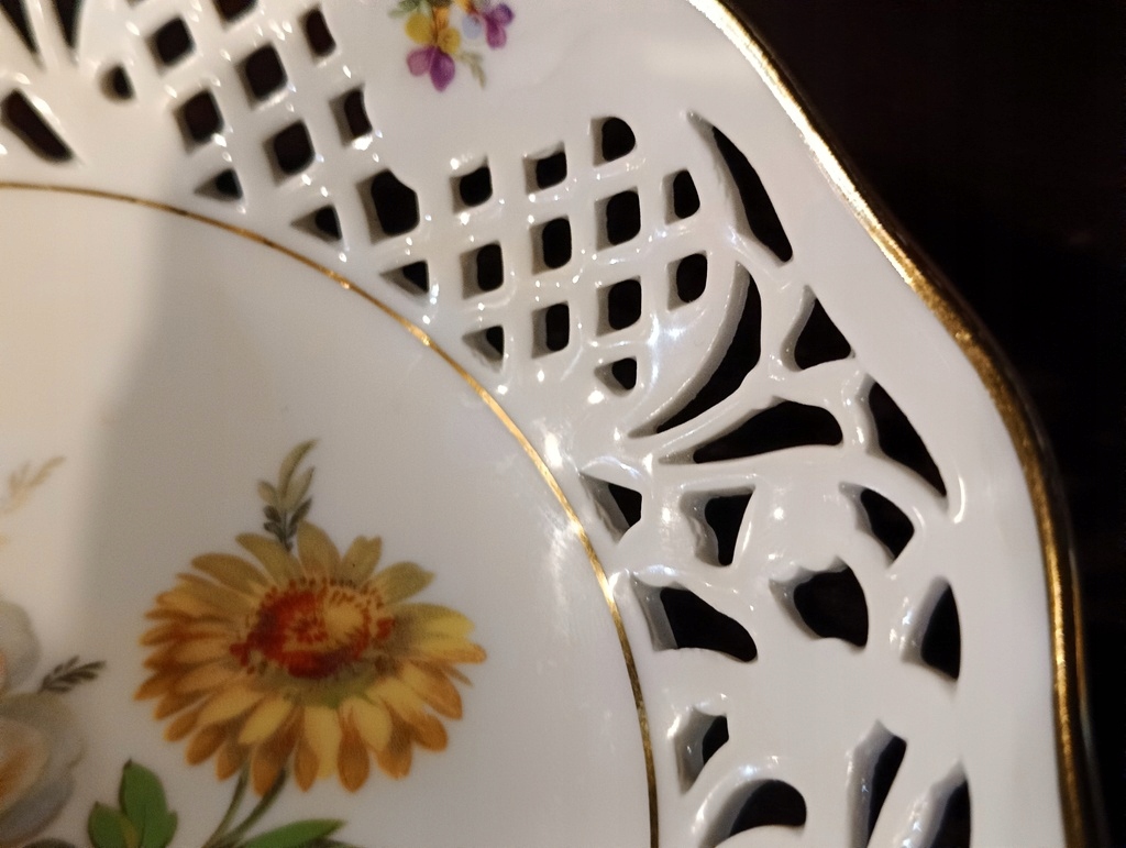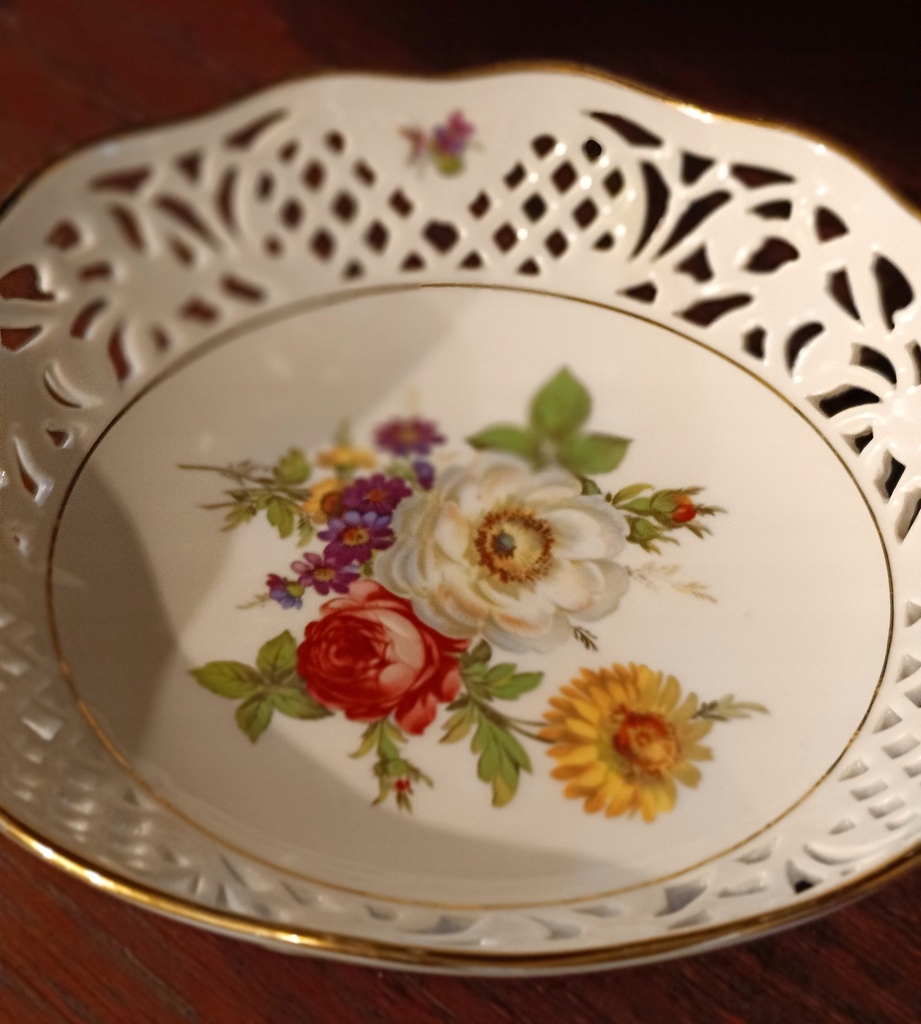 Это старинная фарфоровая чаша с ажурным ободком, имеющая на основании клеймо - FORM MARIENBAD - ИНГРЕС ВАЙС. Чаша б/у, в хорошем состоянии, без сколов и повреждений. Он очаровательный и шикарный, обязательно станет украшением и полезной вещью в вашем доме. Состояние очень хорошее.