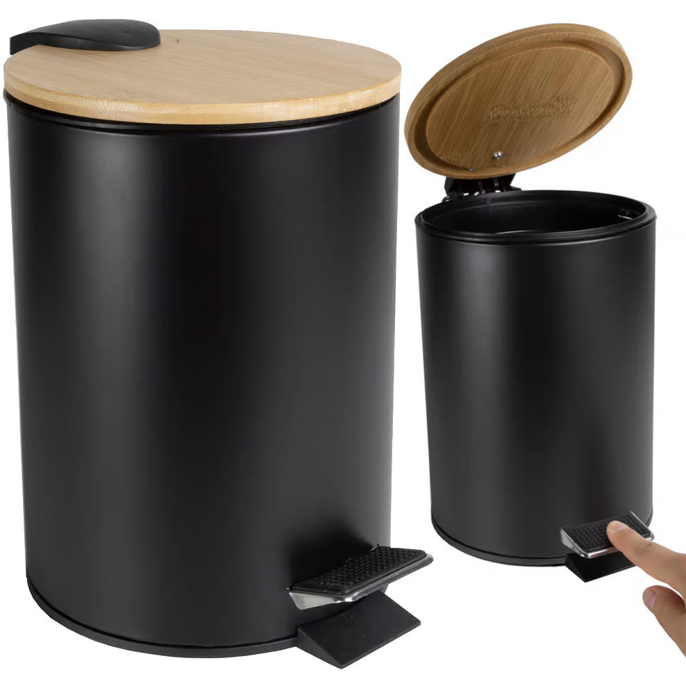 Чёрный цилиндрический совок для мусора будет незаменим в ванной или у туалетного столика, чтобы поддерживать чистоту в помещении. Открывающийся ножной педалью бамбуковый чехол является не только декоративным элементом, который идеально вписывается в стили обустройства: классический, скандинавский, современный или индустриальный, но и предотвращает проникновение нежелательных запахов через съемную вставку. Пластиковая вставка съемная, поэтому вы можете легко опорожнить заполненное мусорное ведро.