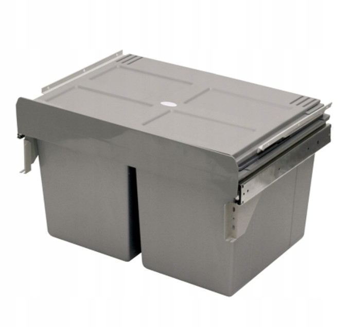 Предлагаемая здесь папка представляет собой версию с передним креплением (передняя часть шкафа крепится к корзине и выдвигается аналогично грузовым корзинам). Корзина работает на направляющих полного выдвижения со встроенным механизмом затяжки и тормозом (корзина закрывается плавно и без захлопывания). Это нижний вариант, предназначенный для шкафов с раковиной. В переплете имеется два контейнера по 27 л. Папка прикреплена к бокам шкафа.