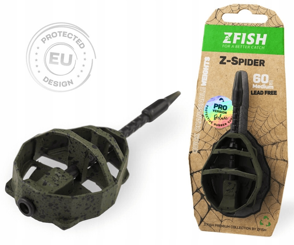 Уникальная форма Spider гарантирует идеальный баланс во время заброса и надежное положение на дне, всегда правой стороной. Новая конструкция опорной рамы обеспечивает оптимальное высвобождение приманки и защиту приманки во время заброса. В состав также входит специальная платформа для точного размещения наживки с крючком, что гарантирует идеальную подачу. Корзины-пауки позволяют быстро менять нагрузку благодаря съемной трубке и отверстию сзади. Просто вытащите трубку, ослабьте леску и замените грузик - без необходимости снова связывать весь набор.