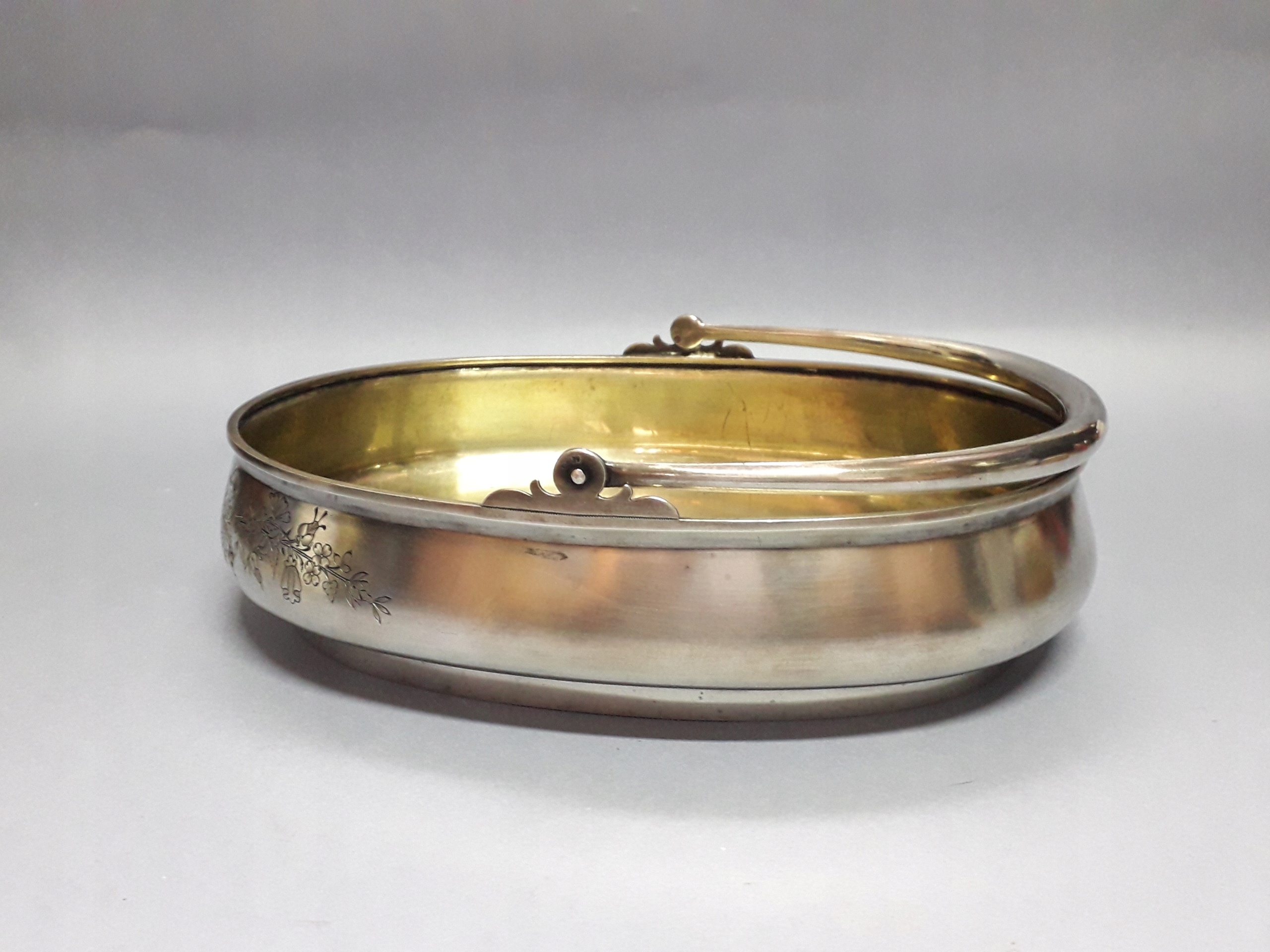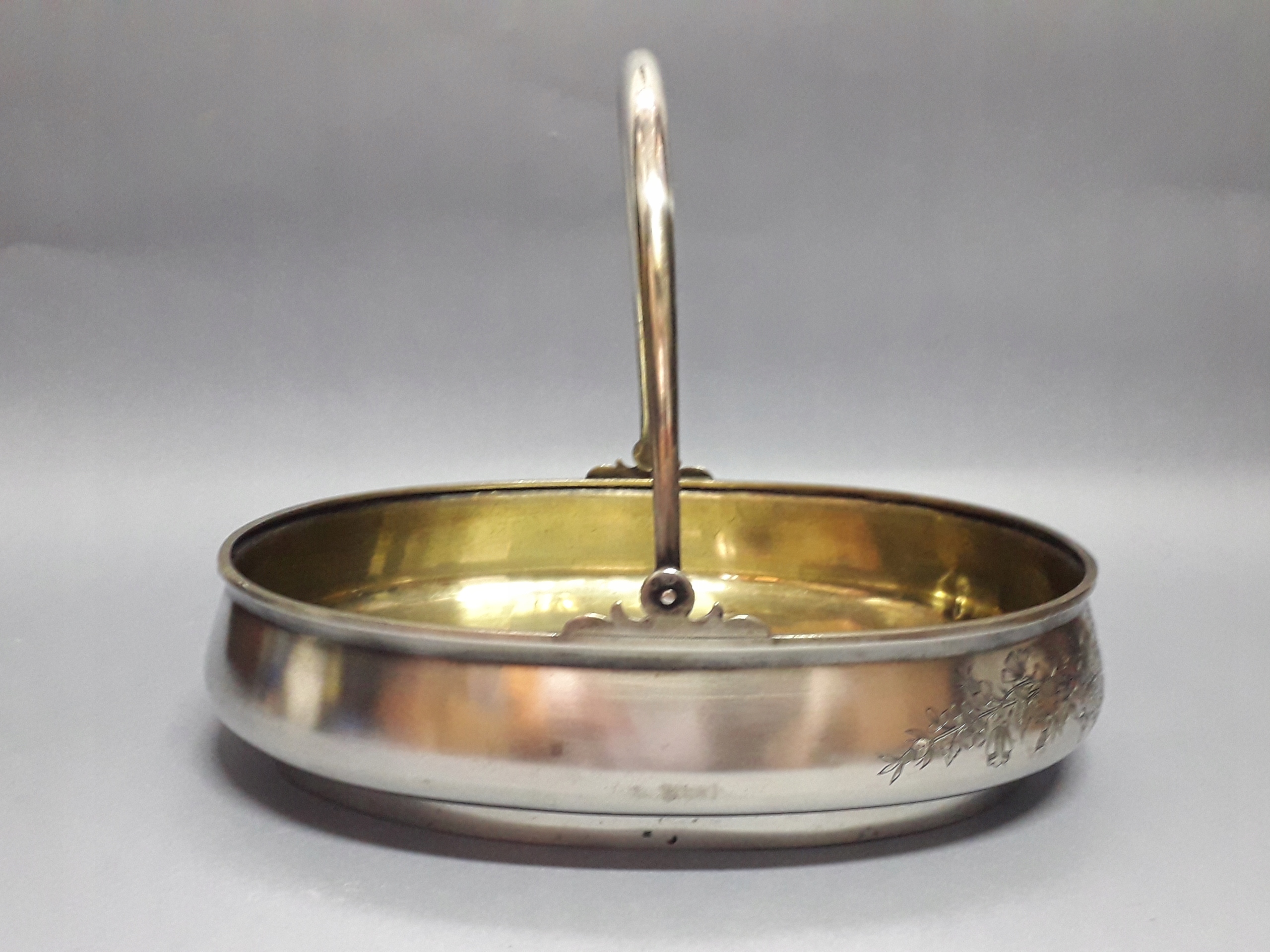 Фруктовая корзина 19-го века. Москва в 1877-1912 годах. Внутри он был первоначально позолочен, сегодня он оставался тонким, золотым внутренним. В передней части корзины выгравирована и окрашенные красивые цветочные украшения, есть круглый медальон с гладкой поверхностью - все еще ждет монограммы :) Функция 84 с 1899- 1908/ Cyrillica, П. !