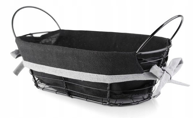 Металлическая корзина черного цвета с тканью подойдет для подачи хлеба, различных видов хлеба, булочек, а также печенья или других сладостей.