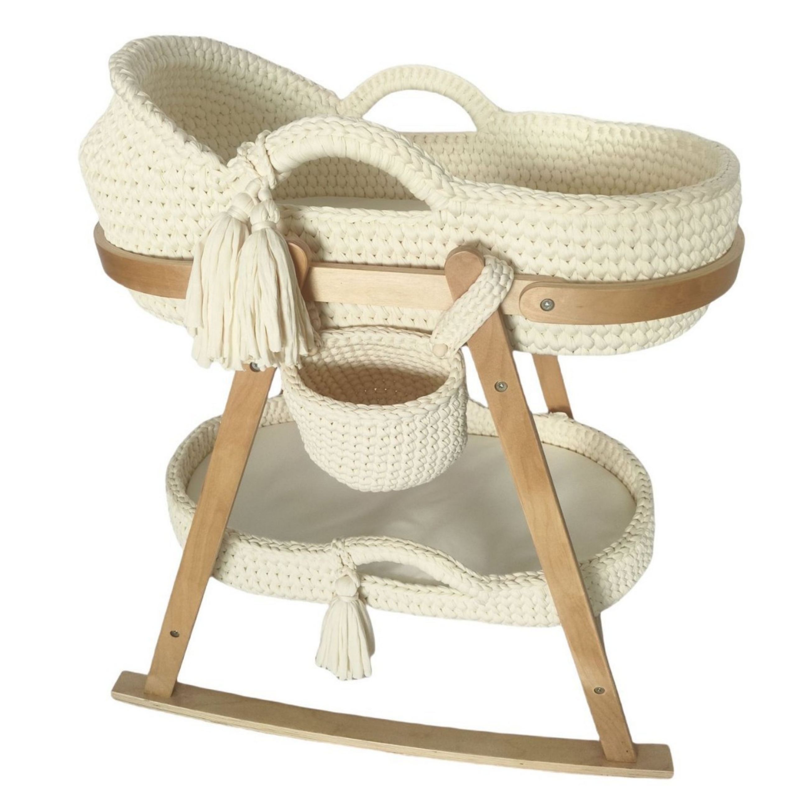 Стильная и уютная детская колыбелька, которая привнесет в ваш дом атмосферу натуральных материалов и вневременного дизайна. Корзина ручной работы на массивном деревянном каркасе не только красиво выглядит, но и мягко покачивается, создавая приятное пространство для малыша.