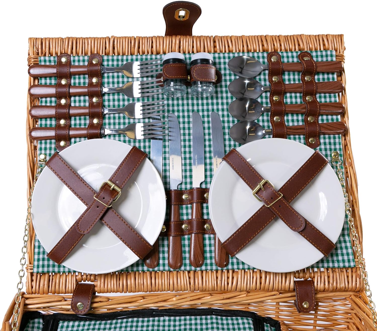 ✅ В корзине находится полный инвентарь на 4 человек, в том числе 4 ложки, 4 вилки, 4 ножа, 4 керамические тарелки, 4 стакана, солонка, перечница. Все, что нужно для приятного пикника с друзьями или семьей.