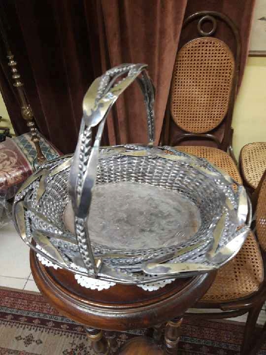 Красивая старинная корзина для хлеба, украшенная колосьями. Корзина посеребренная, на медном дне видны потертости.