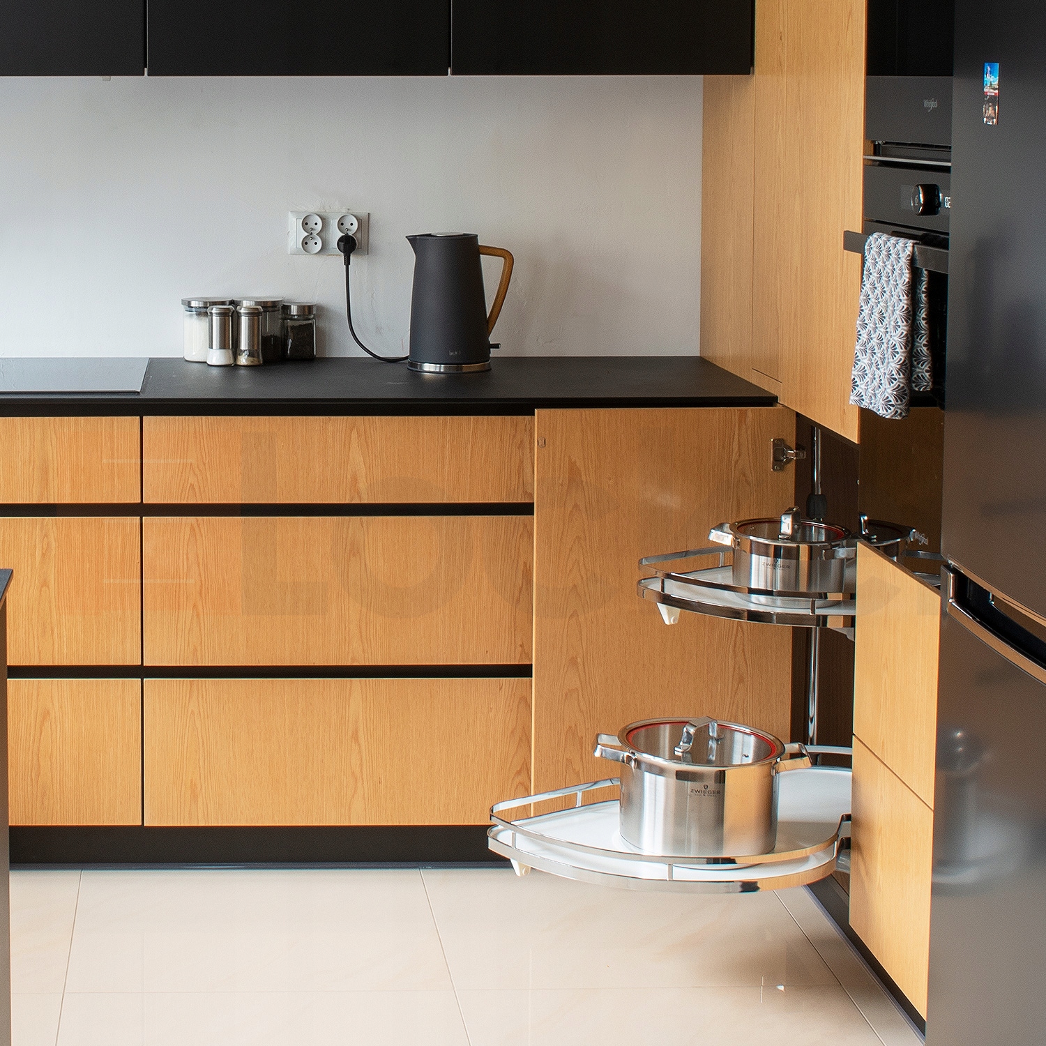 Cargo Magic Corner LCK GEMI 900mm Kidney Right White — система функционального управления пространством нижних угловых шкафов. Полки, выдвигающиеся независимо друг от друга, значительно улучшают функциональность и облегчают доступ к товарам.