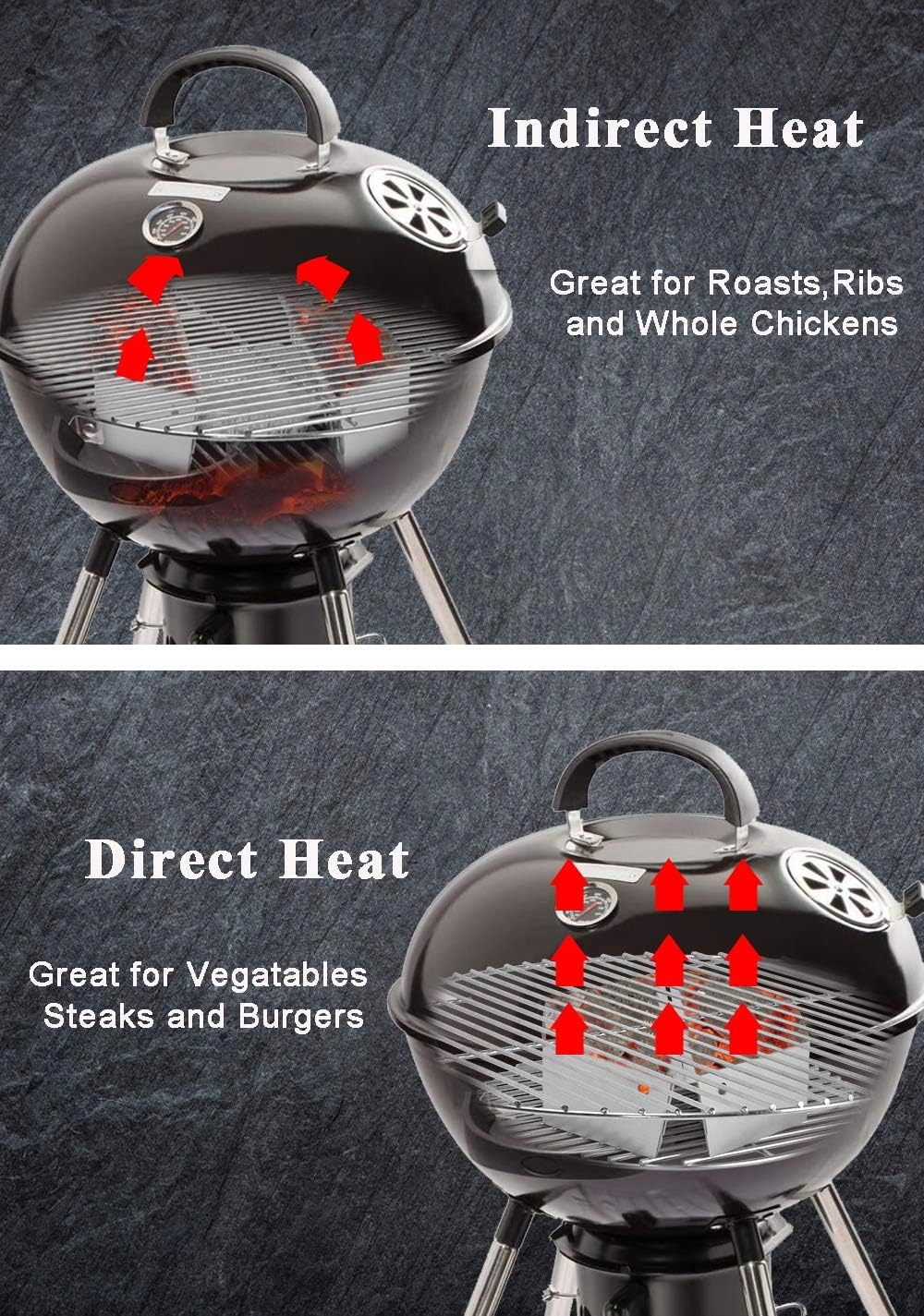 Заполните ячейки углями или древесной щепкой, идеально подходящей для прямого / косвенного гриля, повышает эффективность использования древесного угля.