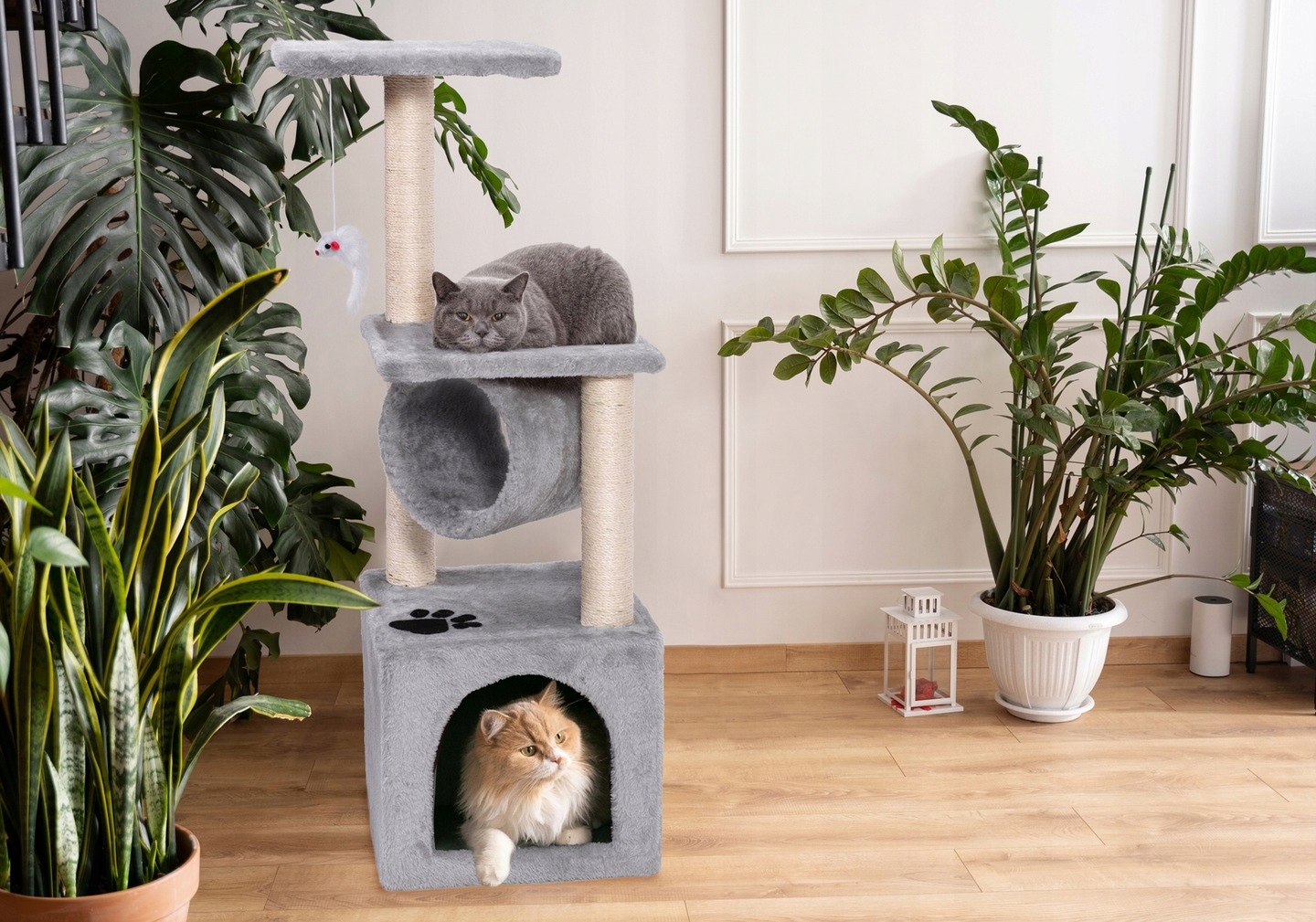 В ней есть дом и три верхних уровня кроватей. Кроме того, под верхним уровнем установлена игрушечная мышка, которая обеспечит интересную забаву вашему пушистому малышу на долгие часы!