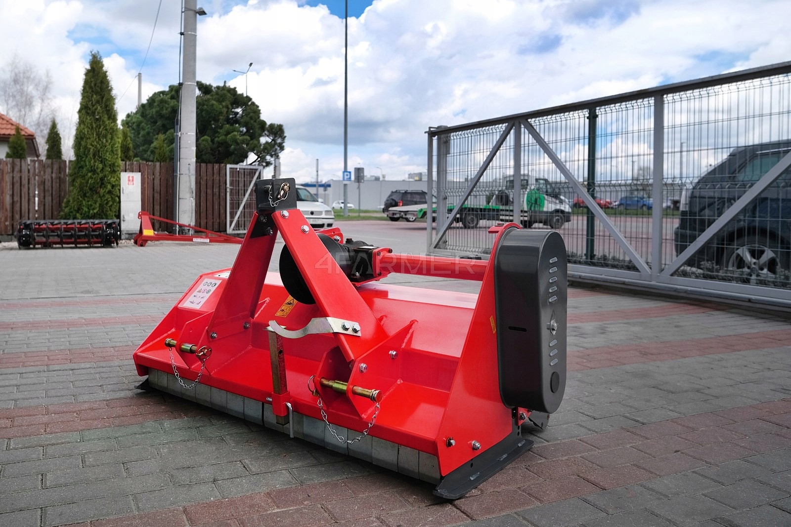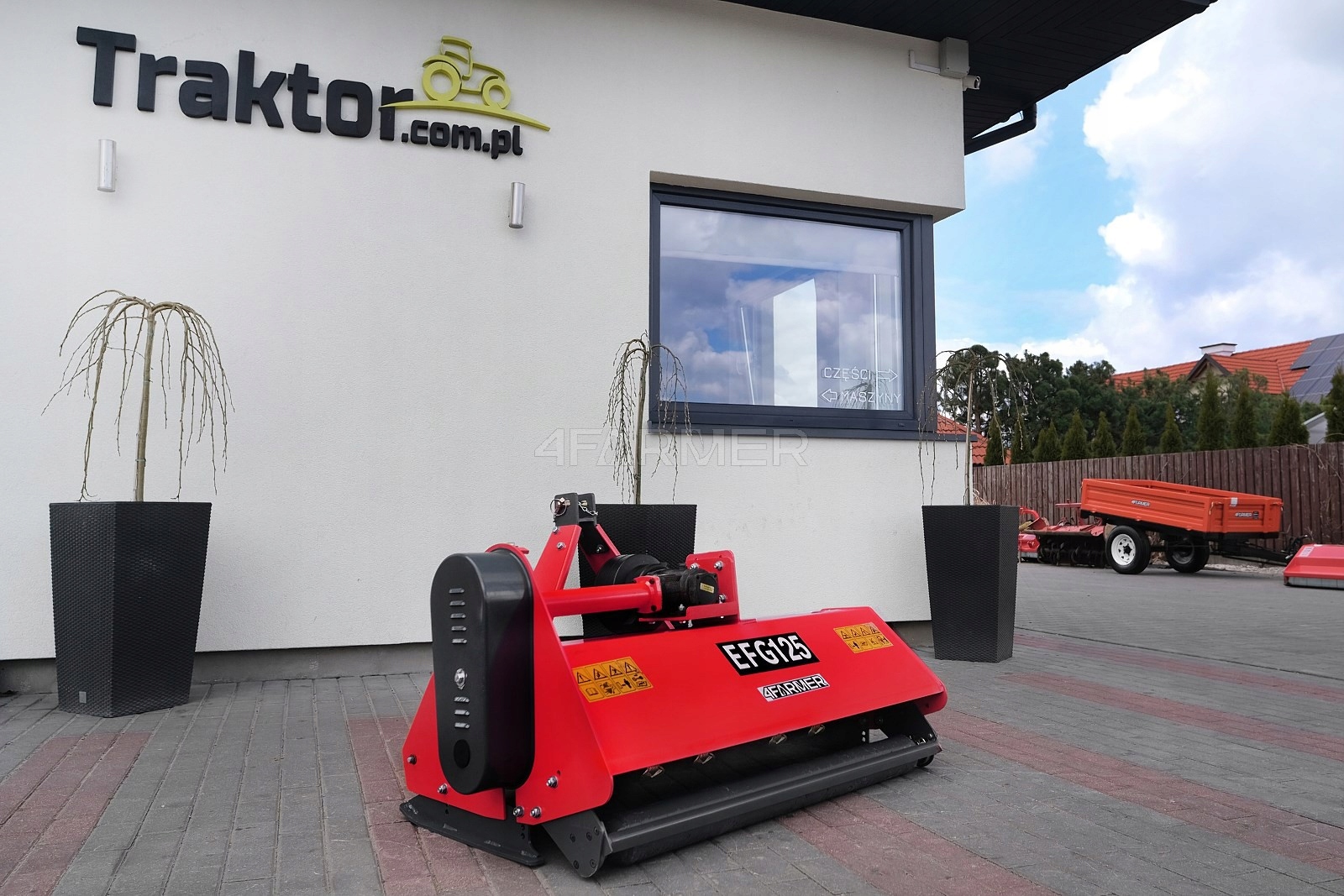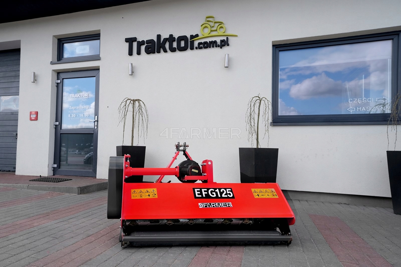 Цеповая косилка (мульчер) EFG 115 4FARMER имеет ширину среза 115 см, в предложении имеется пять доступных вариантов ширины. Помимо цельного рабочего вала, оснащенного горизонтально расположенными измельчающими битами, косилка имеет еще задний (ведомый) вал. Он позволяет регулировать высоту среза и удерживать косилку на выбранной высоте. Привод от ВОМ трактора — 540 об/мин.