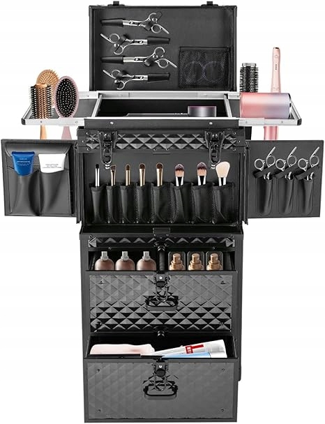 - Эта косметичка на колесиках имеет большую вместительность, множество карманов, ножничные застежки и 2 ящика. Каждый слой предназначен для хранения различных инструментов.