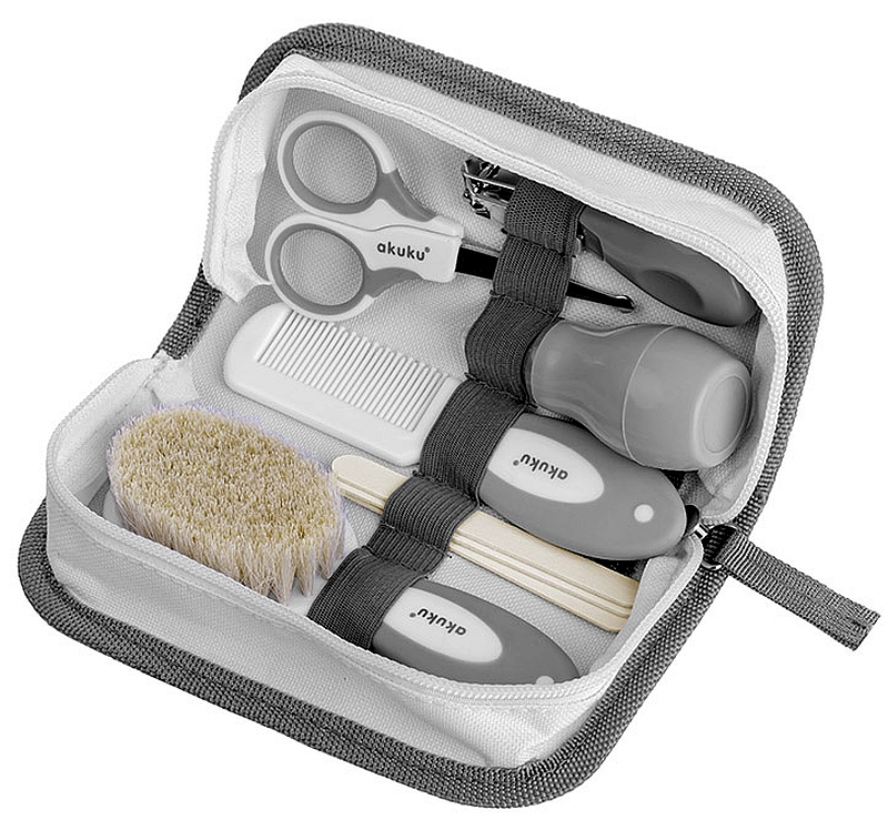 Набор для ухода за вашим ребенком в удобной и практичной косметичке. Ножницы (с тонкими металлическими лезвиями и закругленными краями) и кусачки для ногтей помогут безопасно и надежно подстричь ногти, а пилочка легко устранит неровности ногтей, защитив ребенка от царапин. Мягкая щетка и расческа с нескользящей ручкой позаботятся о голове вашего малыша. Колба с мягким наконечником предназначена для очистки дыхательных путей и удаления воды и ушной серы из ушей ребенка.