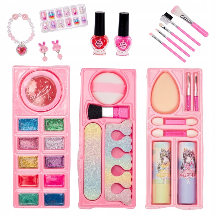 В набор входят красочные тени для век, блестящие лаки для ногтей и различные кисточки, позволяющие создавать множество неповторимых макияжей. В комплект также входят такие украшения, как браслет и серьги, позволяющие создать законченный образ. Дополнительно в комплект входят наращенные ногти и маникюрные аксессуары, чтобы ребенок мог почувствовать себя настоящим стилистом.