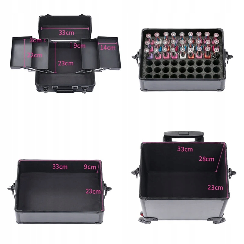 ♡ Чемодан оснащен верхними ящиками, в которых можно разместить косметические средства высотой до 3 см и большинство мелких аксессуаров, например, кисточек для макияжа. , кисти для украшения, зажимы и тени для век. Отделение под ящиками предназначено для напильников, полиролей, ватных дисков без пыли, больших кистей, масел, кремов и подобных продуктов.