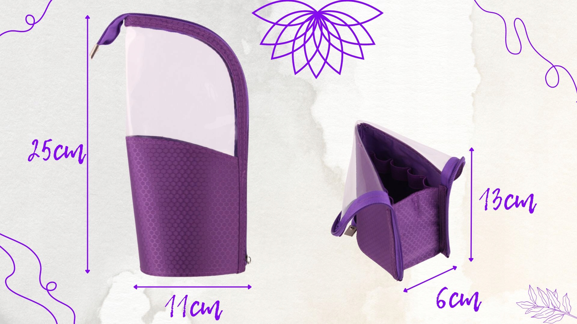- ✅ В косметичке можно разместить до 24 различных кистей в стоячем или закрытом положении или до 35 мелков, ручек или карандашей. Однако длина кисточки для макияжа не может быть длиннее 23 см.