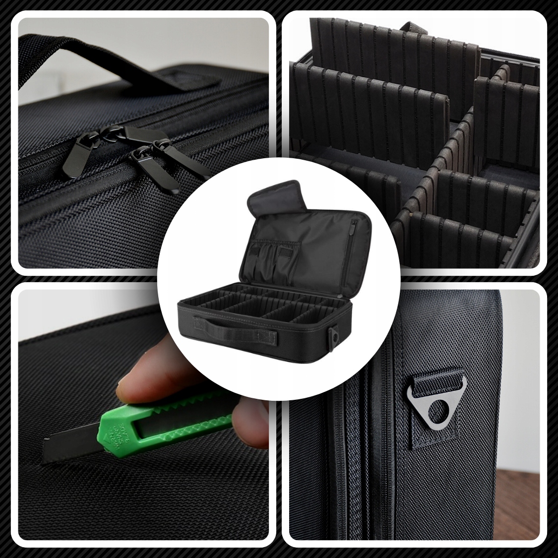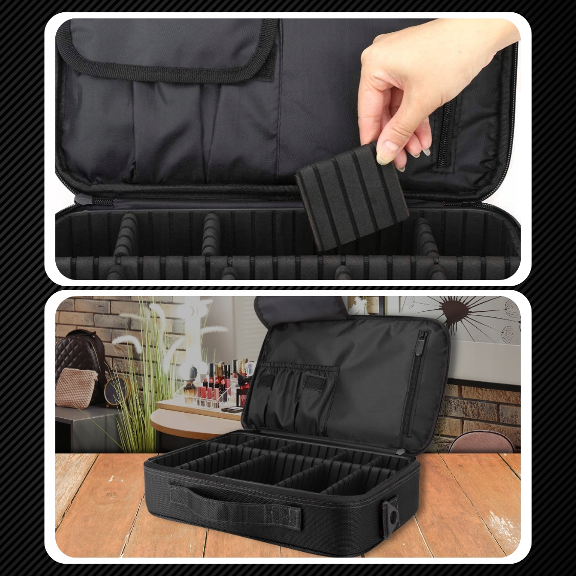 Элегантный усиленный чехол с наплечной сумкой для хранения косметики и аксессуаров для макияжа. Изготовлен из водостойкого материала. Он имеет регулируемые и жесткие перегородки, благодаря которым вы можете регулировать их ширину под свои нужды. Дополнительно оснащен широким отделением на молнии и закрывающимся карманом на резинке.