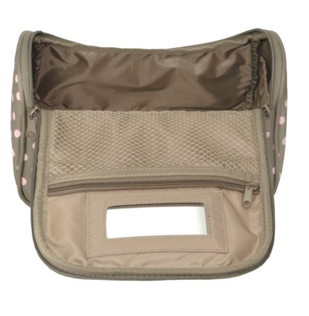 Изготовлен из красивого водонепроницаемого материала теплого бежевого цвета в розовый горошек, который при необходимости очень легко очистить.