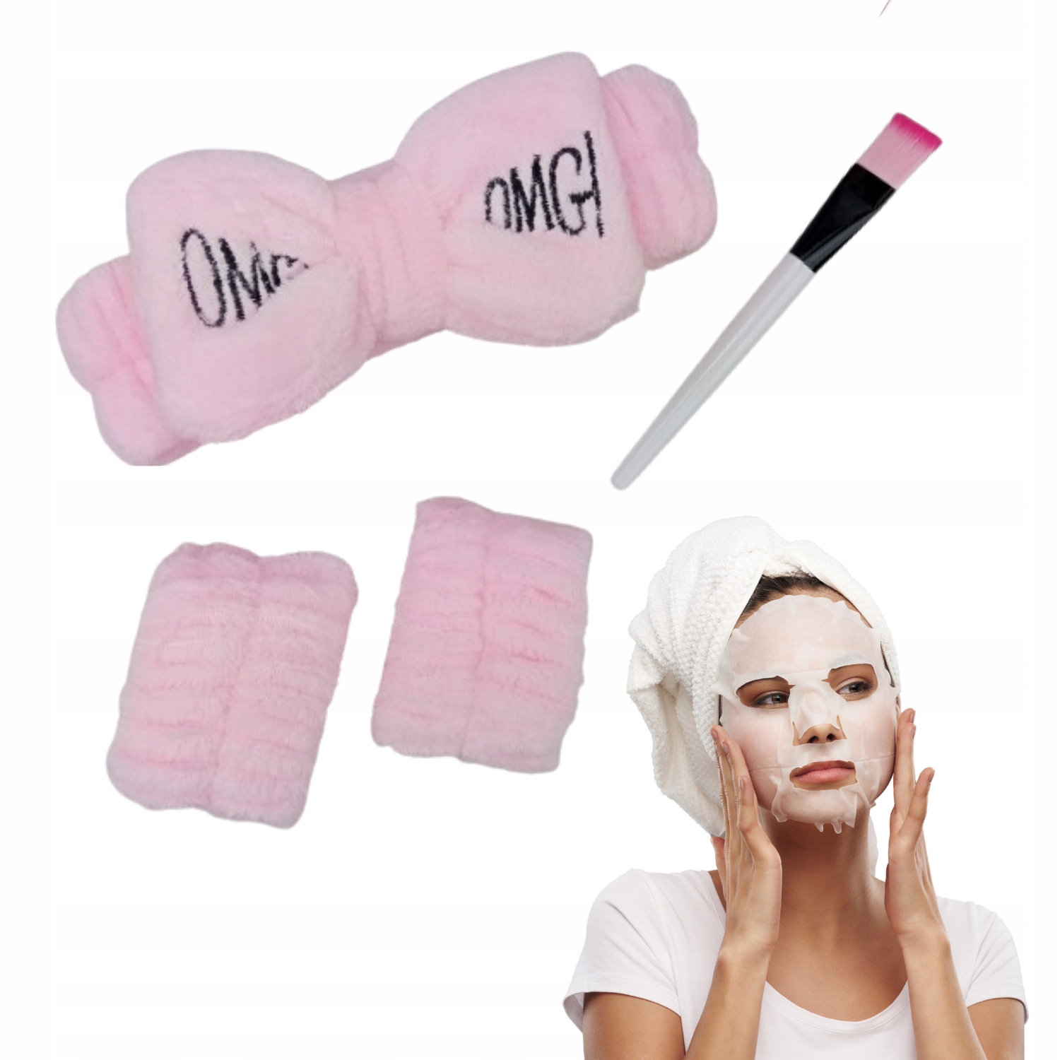 - Мягкий, розовый повязка на голову с большим бантом и надписью «ОМГ!» – идеально подходит для защиты лица от волос во время нанесения ухода или макияжа.
