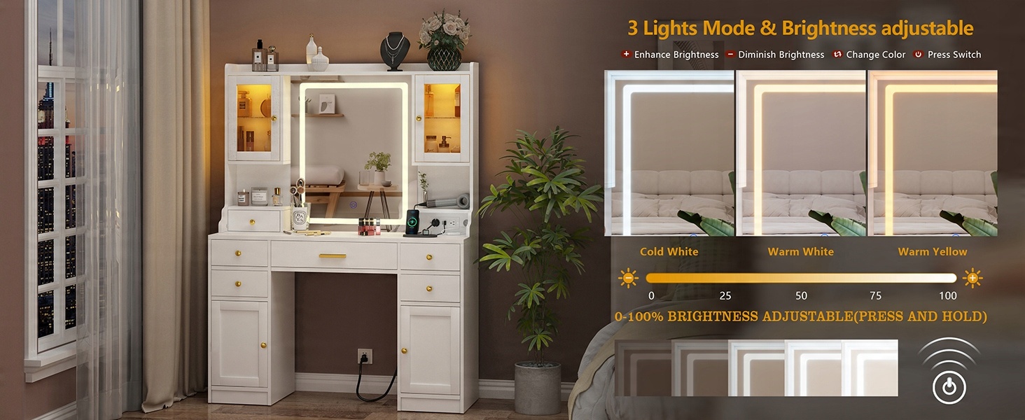 Много места для хранения косметики! Этот туалетный столик имеет 6 ящиков, благодаря которого все аккуратно и упорядочено. Два шкафа выше и ниже и регулируемые полки в шкафу, чтобы удовлетворить ваши потребности в положении предметов разных размеров