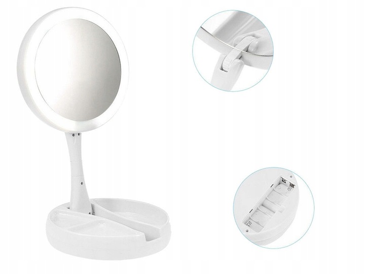 Вокруг зеркала светодиодное освещение, , чтобы мы могли осторожно увидеть наше отражение. освещение загорается с помощью кнопки, расположенной в центральной части основания. Зеркало питается батареями 4 x aa или с использованием батареи 5 В.