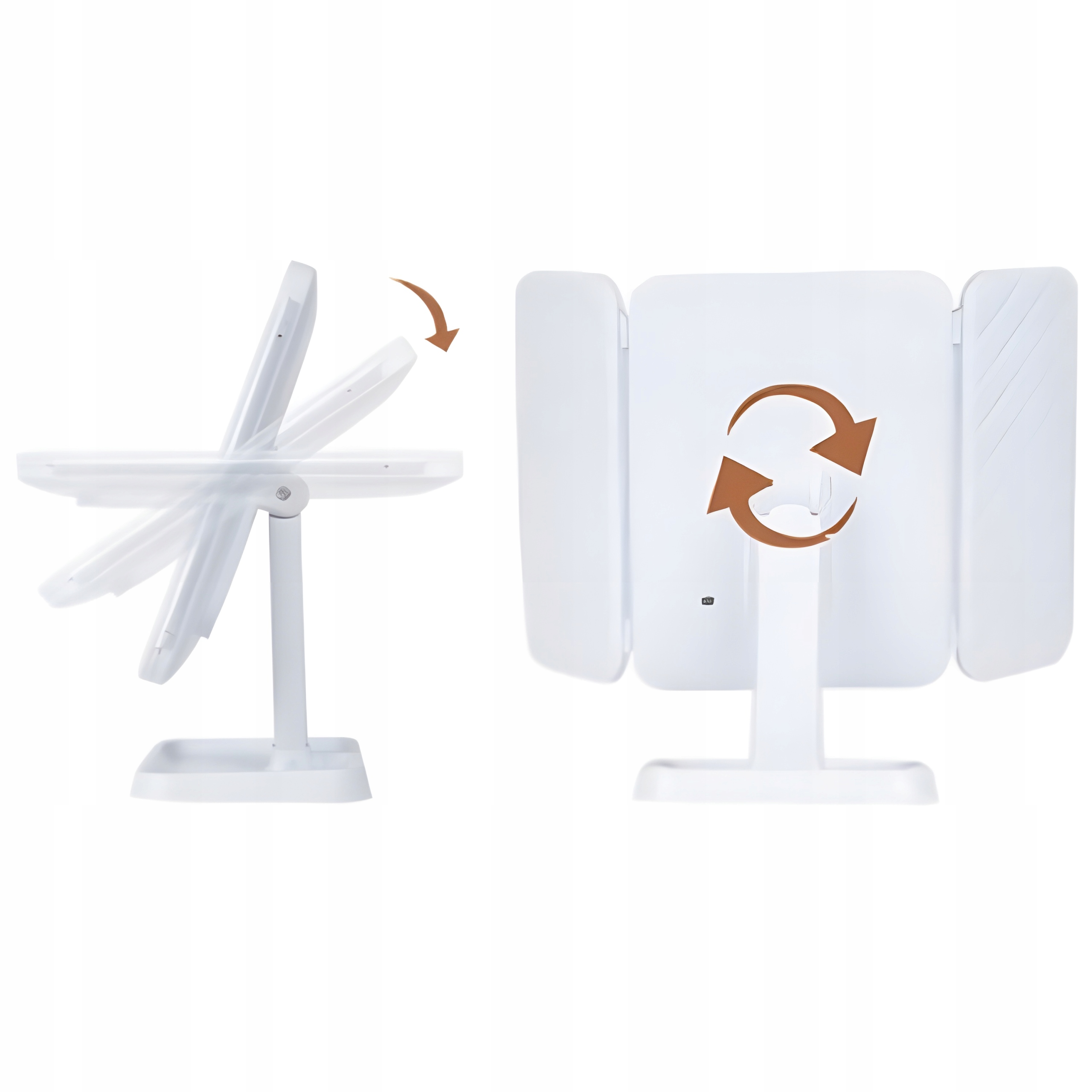Зеркало можно поворачивать на 360°, что позволяет принимать любое положение, обеспечивая идеальный угол и комфорт во время макияжа и ухода.