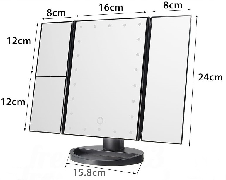 Зеркало с 22 светодиодами, активированными с помощью кнопки с касанием на зеркале. В зависимости от длины давления, интенсивность света меняется. Выберите, как будет наиболее удобным! :)