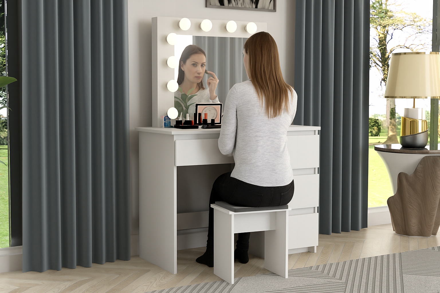 ДЕТАЛЬНОЕ ОПИСАНИЕ Туалетный столик OLA4 – это идеальное сочетание стиля, функциональности и доступной цены. Выполненный в голливудском стиле, он станет не только практичным местом для повседневного макияжа, но и элегантным элементом декора спальни или гардеробной.