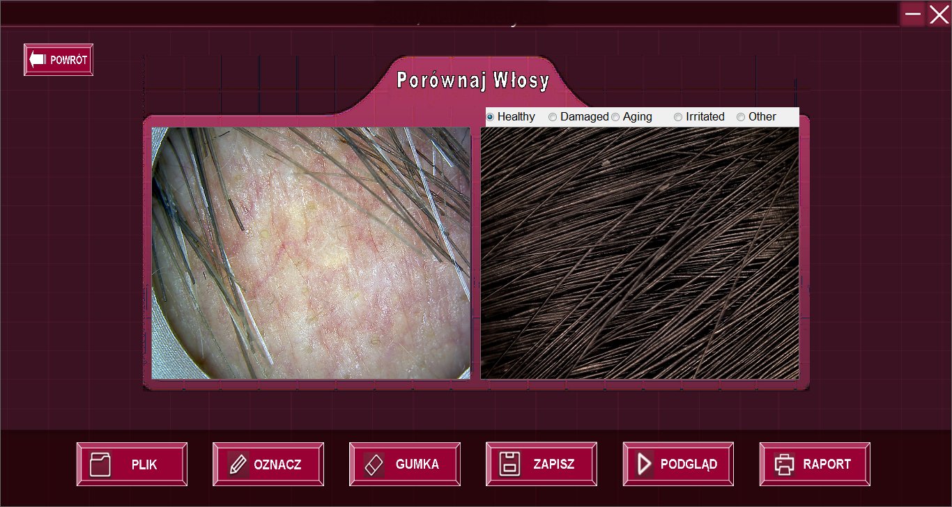 <р>1. Делаем качественную фотографию выбранного участка кожи/волос. <р>2. Измерение интересных деталей. <р>3. Заморозьте фотографию на экране для более детального анализа. <р>4. Сохранение фотографий, сделанных на диске, в файл клиента. <р>5. Создание отчета о замеченных дефектах кожи/волос.МОДУЛЬ: СРАВНЕНИЕ СОСТОЯНИЯ КОЖИ/ВОЛОС
