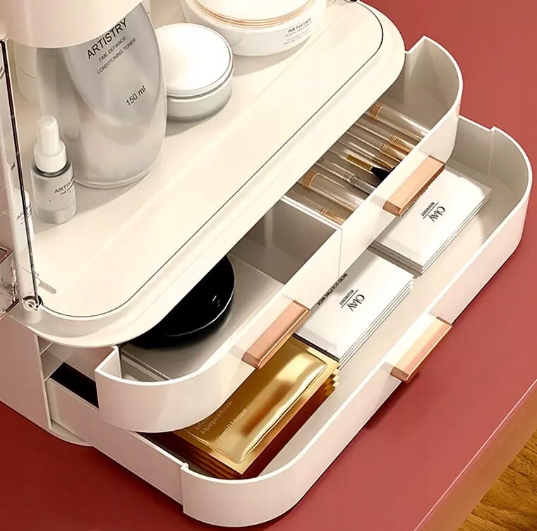 Уникальный органайзер в виде небольшого шкафчика с регулируемым и поворотным зеркалом. Идеально подходит для хранения косметики, аксессуаров и украшений. В верхней части имеется открывающаяся прозрачная дверца с вешалками для украшений и местом для помады. Внутри можно разместить косметику в больших объемах. В нижней части есть три отдельных выдвижных ящика, в которых можно разместить более мелкие продукты, такие как пудра, бронзатор, карандаш, тени и т. д. Ручки из розового золота придают элегантный вид. p>