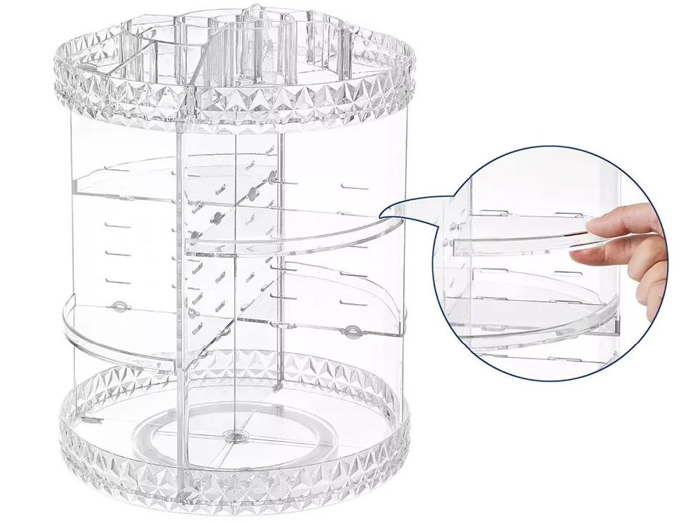 Повернут на 360 градусов для удобного доступа к косметике. Он имеет 7 уровней, которые мы можем свободно менять в зависимости от наших потребностей. Органайзер помогает экономить место и организовывать наши косметические аксессуары. Легко чистится, идеален в качестве подарка.