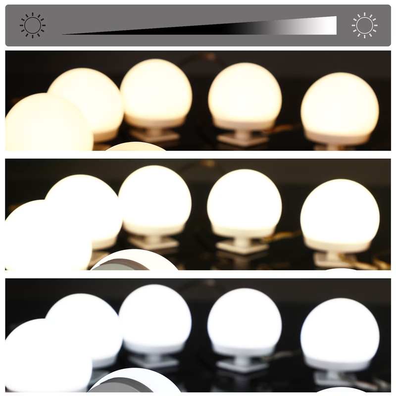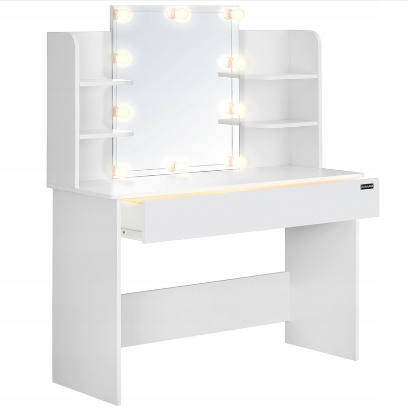 Средства для стайлинга или парфюмерию можно разместить на 4 полках. Благодаря плавно движущимся металлическим направляющим ящик легко открывается. Подсветка ящика включается автоматически по датчику движения после его выдвижения. 10 светодиодов имеют 10 уровней яркости и регулируются в 3 режимах освещения: теплый белый, естественный белый и белый, а также подключаются к питанию через USB-кабель. Простые в уходе поверхности туалетного столика при загрязнении можно протирать мягкой влажной тряпкой.