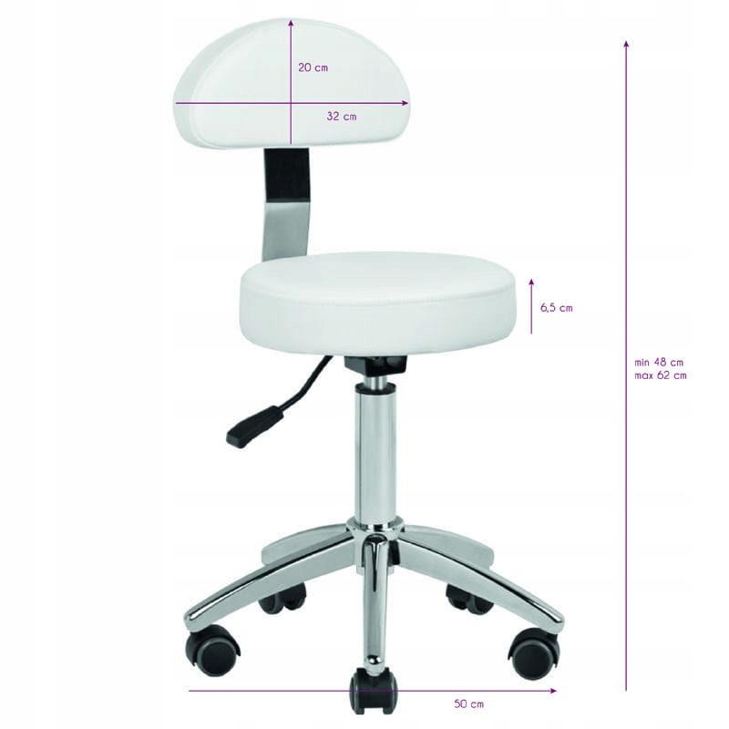 Удобный косметический табурет, устойчивый на пятизвездочном основании, на прорезиненных колесах, с возможностью разбора спинки, белый.