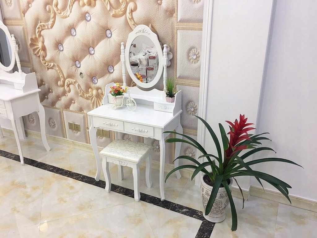 Косметический туалетный столик прикреплен очень удобный табурет b>, который идеально адаптируется к стилю мебели. Деликатные украшения и профилированные ноги дадут каждому интерьеру правильный характер. Обивка табурета заполнена мягкой пеной, которая обеспечит Comfort при создании макияжа.