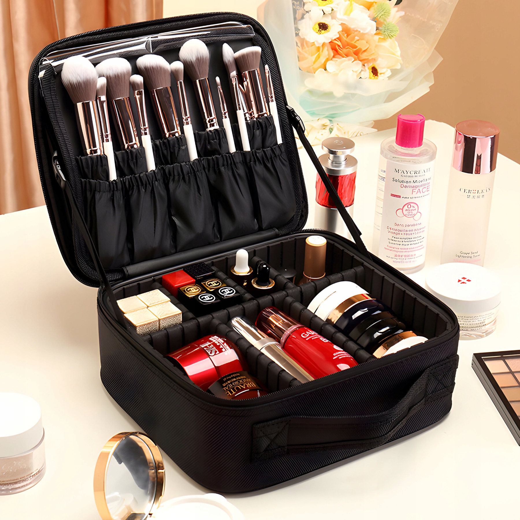 Органайзер для косметики с дополнительными карманами внутри был разработан с учетом функциональности. Дорожная косметичка имеет 4 просторных кармана на резинках, например, для косметических кисточек и 7 отделений с жесткими стенками для деликатной косметики в стеклянных контейнерах. Благодаря многофункциональному футляру они всегда остаются на месте во время транспортировки, сводя к минимуму риск повреждения и беспорядка.