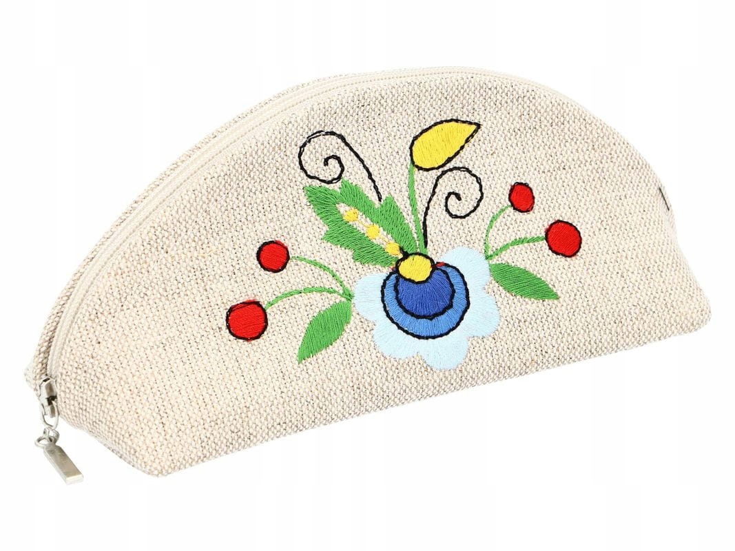 Линейная косметичка с вышитыми вручную кашубскими узорами Жуковской школы - семицветной разновидностью кашубской вышивки. Узоры на косметичке выполнены плоской, растушеванной вышивкой. Застегивается на молнию.