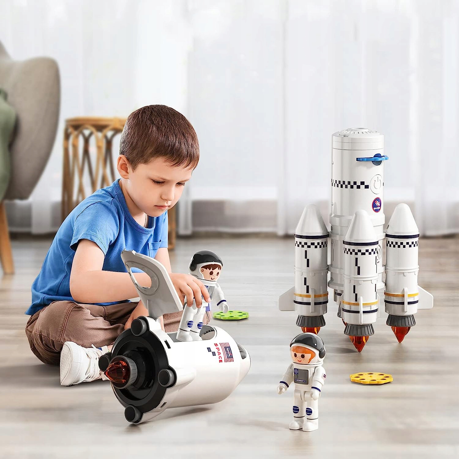 Ракета состоит из двух космонавтов, космического корабля, ракеты первой ступени, ракеты второй ступени и четырех бустеры. Каждую кабину можно использовать индивидуально или как часть более крупного космического корабля. Играя, дети также могут научиться строить ракеты и получить массу удовольствия.