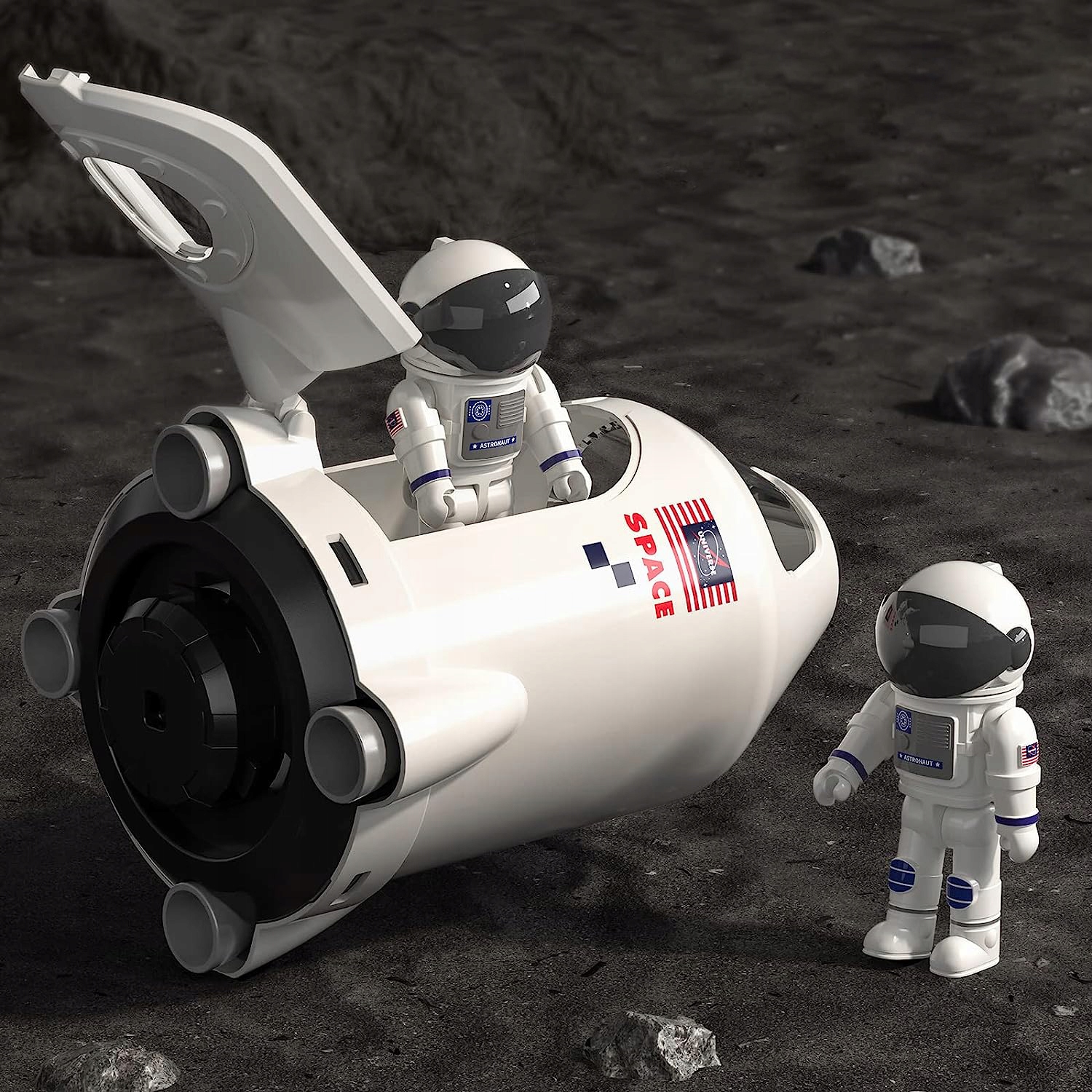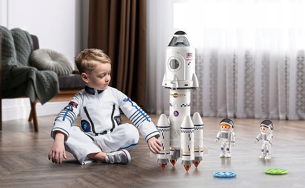 Ракета состоит из двух космонавтов, космического корабля, ракеты первой ступени, ракеты второй ступени и 4 ускорителей. Съемный игровой набор «Астронавт» также можно переносить, и дети могут участвовать в космических приключениях!