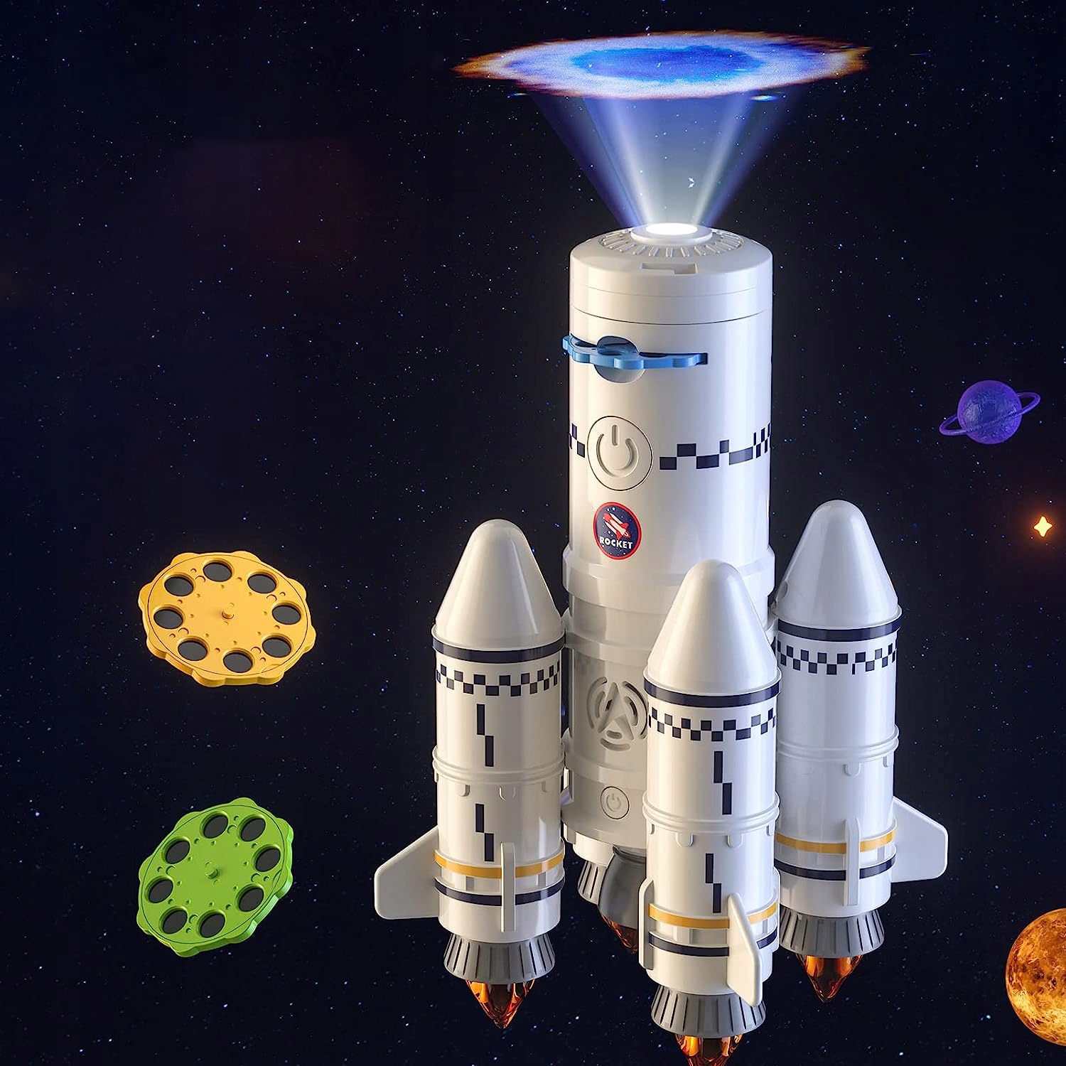 Эта суперкрутая ракета также является мини-проектором. Слайд-шоу на три темы: космос, галактика и планеты, всего 24 фотографии, вращайте барабаны вручную для просмотра следующего слайд-шоу.