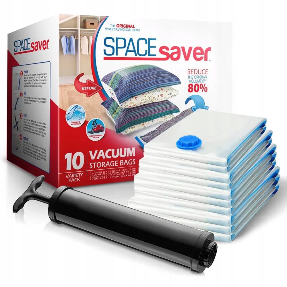 - ЛУЧШАЯ СУМКА ДЛЯ ЭКОНОМИИ ПРОСТРАНСТВА НА РЫНКЕ! Вакуумные пакеты для хранения Spacesaver прочны, долговечны, устойчивы к проколам и пригодны для многократного использования! Независимо от того, используете ли вы вакуумные пакеты для одеяла, одеяла, постельного белья, пухового одеяла, наматрасника, подушки, ковра или одежды, эти вакуумные пакеты защитят снова и снова!