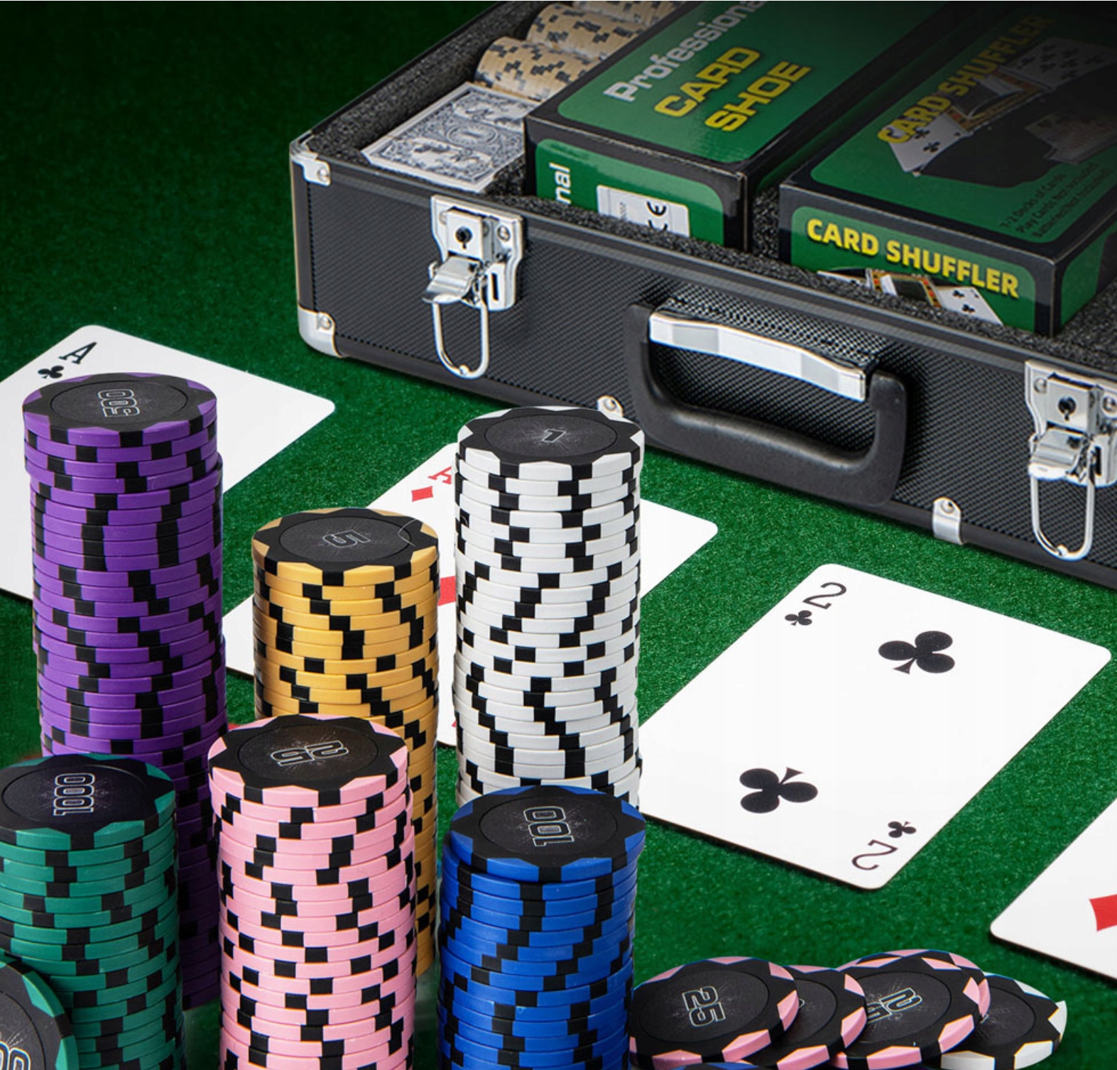 Будьте готовы выиграть в игре с набором покерных токенов Croasd Black 600 Piece Claytec. Набор содержит 600 токенов, шесть колод карт, пять кубиков и три дилерских пуговица, один покерный войло, одна игровая обувь и одна карта. Все токены состоят из слоя фольги, композитного слоя и железного слоя. Каждый токен весит 14 г, чтобы обеспечить аутентичный опыт казино. Наборы токенов имеют шесть различных цветов: 150 белых, 150 желтых, 100 розовых, 100 синих, 50 фиолетовых и 50 зеленых токенов. Этот изысканный набор токенов покера также содержит шесть колод игровых карт на уровне казино. Каждая карта изготовлена из 100% пластика и покрыта водонепроницаемой и прочной матовой отделкой. Прочный алюминиевый корпус имеет тщательно сделанное внешнее покрытие с двумя клавишами, двумя зажидками и сплошной ручкой. Card Caterpillar автоматически меняет две палубы карт за 2,5 секунды. Набор токенов покера будет идеальным для четырех до десяти любителей покера, которые хотят насладиться игрой вместе